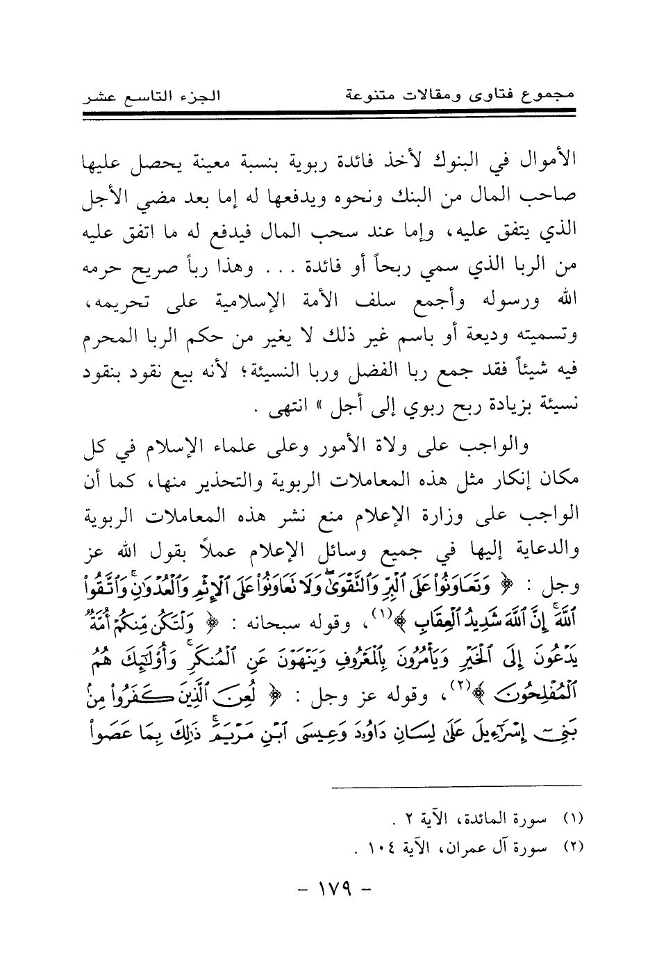 والواجب على ولاة الأمور وعلى علماء الإسلام في كل مكان إنكار مثل هذه المعاملات الربوية والتحذير منها، كما أن الواجب على وزارة الإعلام منع نشر هذه المعاملات الربوية والدعاية إليها في جميع وسائل الإعلام عملا بقول الله عز وجل: {وَتَعَاوَنُوا عَلَى الْبِرِّ وَالتَّقْوَى وَلَا تَعَاوَنُوا عَلَى الْإِثْمِ وَالْعُدْوَانِ وَاتَّقُوا اللَّهَ إِنَّ اللَّهَ شَدِيدُ الْعِقَابِ} (¬1) وقوله سبحانه: {وَلْتَكُنْ مِنْكُمْ أُمَّةٌ يَدْعُونَ إِلَى الْخَيْرِ وَيَأْمُرُونَ بِالْمَعْرُوفِ وَيَنْهَوْنَ عَنِ الْمُنْكَرِ وَأُولَئِكَ هُمُ الْمُفْلِحُونَ} (¬2) وقوله عز وجل: {لُعِنَ الَّذِينَ كَفَرُوا مِنْ بَنِي إِسْرَائِيلَ عَلَى لِسَانِ دَاوُدَ وَعِيسَى ابْنِ مَرْيَمَ ذَلِكَ بِمَا عَصَوْا وَكَانُوا يَعْتَدُونَ} (¬3) {كَانُوا لَا يَتَنَاهَوْنَ عَنْ مُنْكَرٍ فَعَلُوهُ لَبِئْسَ مَا كَانُوا يَفْعَلُونَ} (¬4)