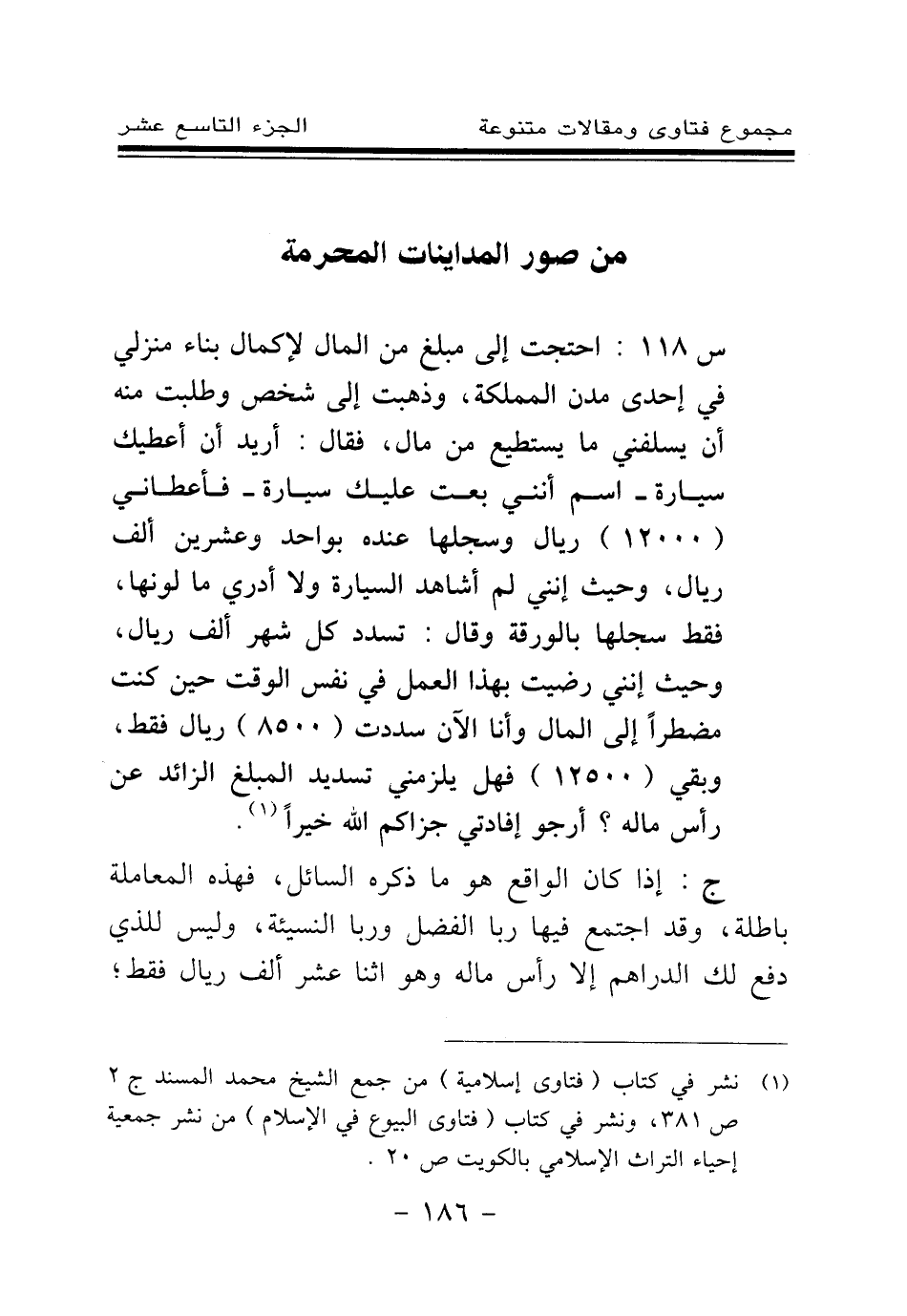 س 118: احتجت إلى مبلغ من المال لإكمال بناء منزلي في إحدى مدن المملكة، وذهبت إلى شخص وطلبت منه أن يسلفني ما يستطيع من مال، فقال: أريد أن أعطيك سيارة - اسم أنني بعت عليك سيارة - فأعطاني (12000) ريال وسجلها عنده بواحد وعشرين ألف ريال، وحيث إنني لم أشاهد السيارة ولا أدري ما لونها، فقط سجلها بالورقة وقال: تسدد كل شهر ألف ريال، وحيث إنني رضيت بهذا العمل في نفس الوقت حين كنت مضطرا إلى المال وأنا الآن سددت (8500) ريال فقط، وبقي (12500) فهل يلزمني تسديد المبلغ الزائد عن رأس ماله؟ أرجو إفادتي جزاكم الله خيرا