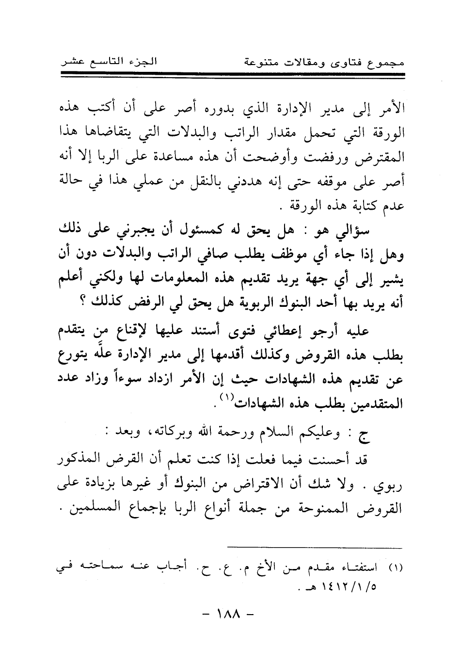 الأمر إلى مدير الإدارة الذي بدوره أصر على أن أكتب هذه الورقة التي تحمل مقدار الراتب والبدلات التي يتقاضاها هذا المقترض، ورفضت وأوضحت أن هذه مساعدة على الربا إلا أنه أصر على موقفه حتى إنه هددني بالنقل من عملي هذا في حالة عدم كتابة هذه الورقة.
