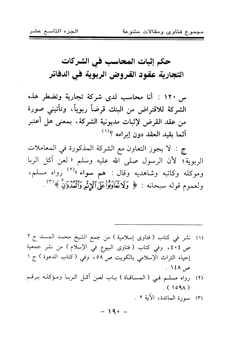 س 120: أنا محاسب لدى شركة تجارية وتضطر هذه الشركة للإقراض من البنك قرضا ربويا، وتأتيني صورة من عقد القرض لإثبات مديونية الشركة، بمعنى هل أعتبر آثما بقيد العقد دون إبرامه؟