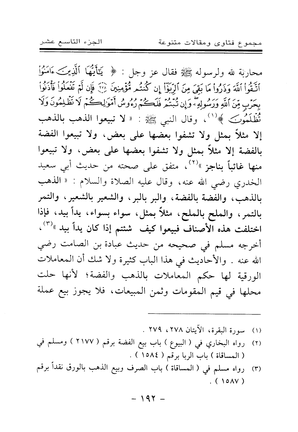 محاربة لله ولرسوله صلى الله عليه وسلم فقال عز وجل: {يَا أَيُّهَا الَّذِينَ آمَنُوا اتَّقُوا اللَّهَ وَذَرُوا مَا بَقِيَ مِنَ الرِّبَا إِنْ كُنْتُمْ مُؤْمِنِينَ} (¬1) {فَإِنْ لَمْ تَفْعَلُوا فَأْذَنُوا بِحَرْبٍ مِنَ اللَّهِ وَرَسُولِهِ وَإِنْ تُبْتُمْ فَلَكُمْ رُءُوسُ أَمْوَالِكُمْ لَا تَظْلِمُونَ وَلَا تُظْلَمُونَ} (¬2) وقال النبي صلى الله عليه وسلم: «لا تبيعوا الذهب بالذهب إلا مثلا بمثل ولا تشفوا بعضها على بعض، ولا تبيعوا الفضة بالفضة إلا مثلا بمثل ولا تشفوا بعضها على بعض، ولا تبيعوا منها غائبا بناجز (¬3) » متفق على صحته من حديث أبي سعيد الخدري رضي الله عنه، وقال عليه الصلاة والسلام: «الذهب بالذهب، والفضة بالفضة، والبر بالبر، والشعير بالشعير، والتمر بالتمر، والملح بالملح، مثلا بمثل، سواء بسواء، يدا بيد، فإذا اختلفت هذه الأصناف فبيعوا كيف شئتم إذا كان يدا بيد (¬4) » أخرجه مسلم في صحيحه من حديث عبادة بن الصامت رضي الله عنه. والأحاديث في هذا الباب كثيرة، ولا شك أن المعاملات الورقية لها حكم المعاملات بالذهب والفضة؛ لأنها حلت محلها في قيم المقومات وثمن المبيعات، فلا يجوز بيع عملة