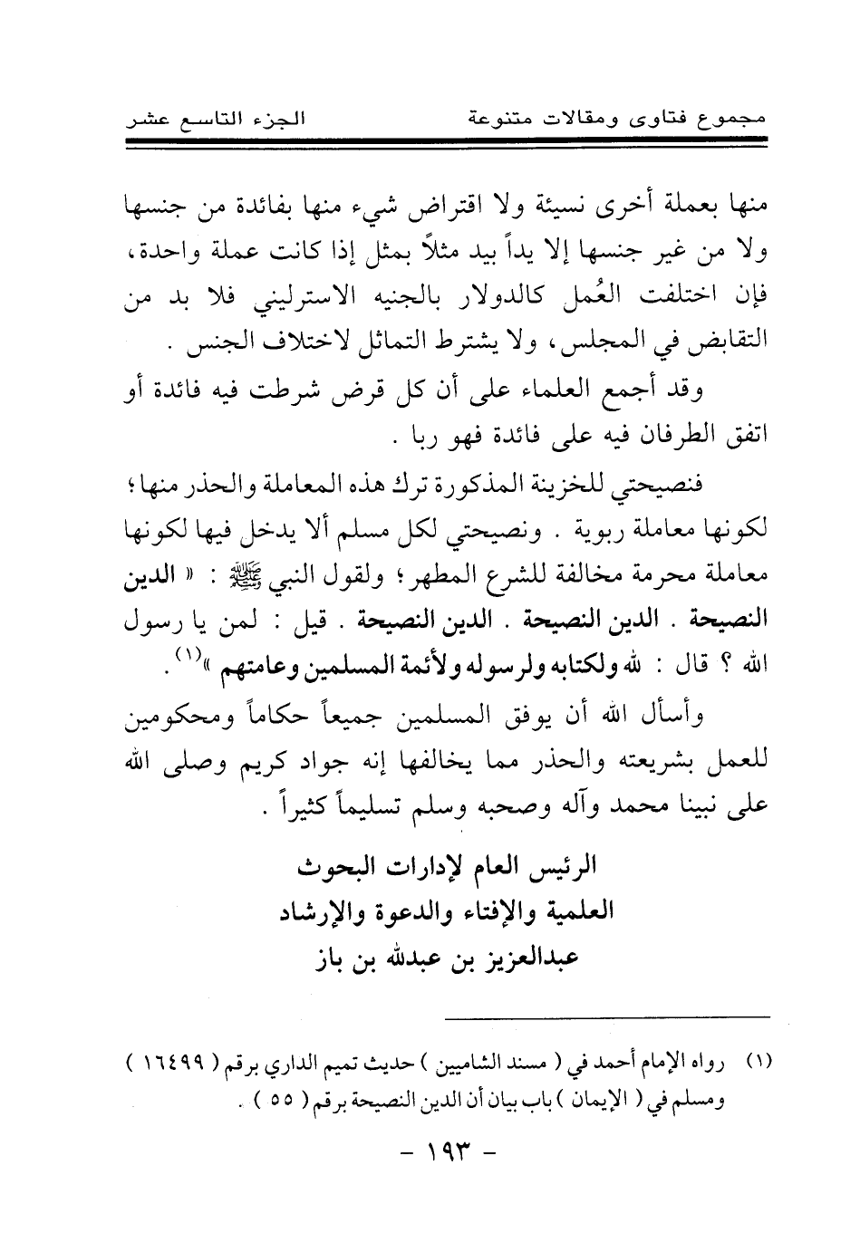 فنصيحتي للخزينة المذكورة ترك هذه المعاملة والحذر منها؛ لكونها معاملة ربوية. ونصيحتي لكل مسلم ألا يدخل فيها لكونها معاملة محرمة مخالفة للشرع المطهر؛ ولقول النبي صلى الله عليه وسلم: «الدين النصيحة. الدين النصيحة. الدين النصيحة. قيل: لمن يا رسول الله؟ قال: لله ولكتابه ولرسوله ولأئمة المسلمين وعامتهم (¬1) »