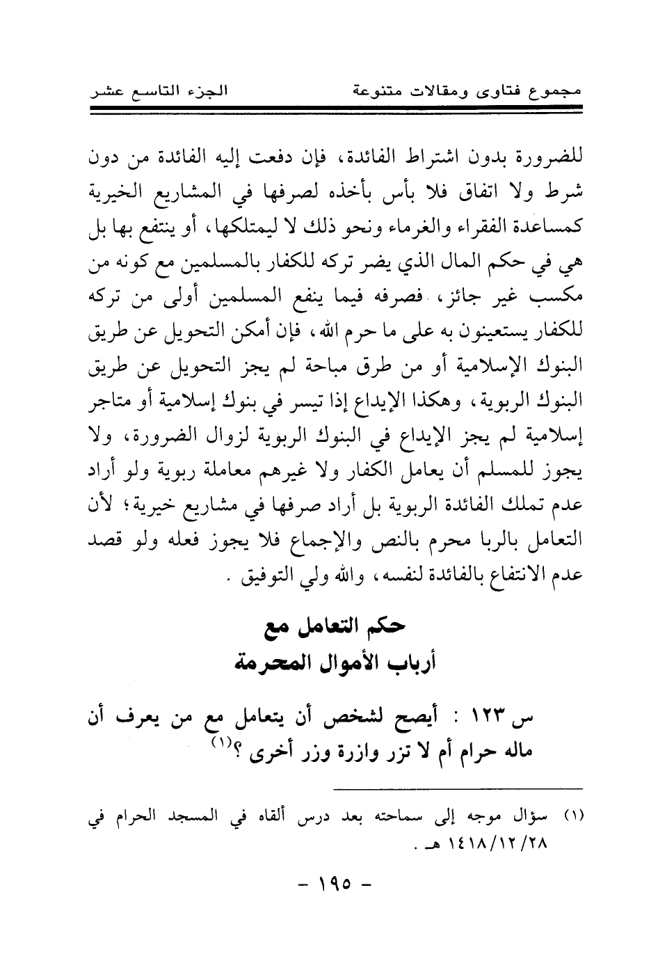 للضرورة بدون اشتراط الفائدة، فإن دفعت إليه الفائدة من دون شرط ولا اتفاق، فلا بأس بأخذه لصرفها في المشاريع الخيرية كمساعدة الفقراء والغرماء ونحو ذلك لا ليمتلكها، أو ينتفع بها بل هي في حكم المال الذي يضر تركه للكفار بالمسلمين مع كونه من مكسب غير جائز، فصرفه فيما ينفع المسلمين أولى من تركه للكفار يستعينون به على ما حرم الله، فإن أمكن التحويل عن طريق البنوك الإسلامية أو من طرق مباحة لم يجز التحويل عن طريق البنوك الربوية، وهكذا الإيداع إذا تيسر في بنوك إسلامية أو متاجر إسلامية لم يجز الإيداع في البنوك الربوية لزوال الضرورة، ولا يجوز للمسلم أن يعامل الكفار ولا غيرهم معاملة ربوية ولو أراد عدم تملك الفائدة الربوية بل أراد صرفها في مشاريع خيرية؛ لأن التعامل بالربا محرم بالنص والإجماع فلا يجوز فعله ولو قصد عدم الانتفاع بالفائدة لنفسه، والله ولي التوفيق.