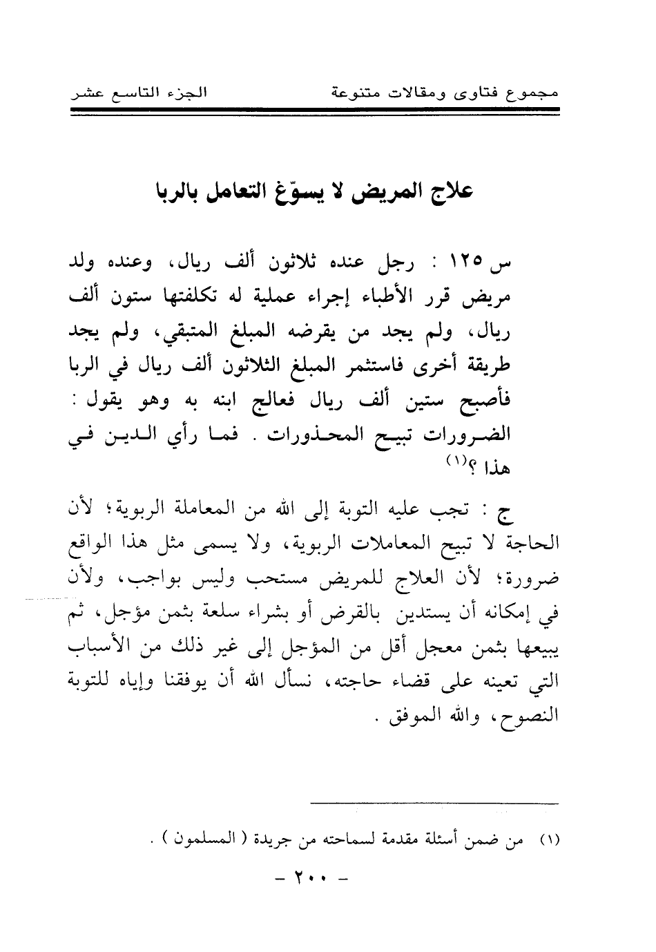 س 125: رجل عنده ثلاثون ألف ريال، وعنده ولد مريض قرر الأطباء إجراء عملية له تكلفتها ستون ألف ريال، ولم يجد من يقرضه المبلغ المتبقي، ولم يجد طريقة أخرى فاستثمر المبلغ الثلاثون ألف ريال في الربا فأصبح ستين ألف ريال فعالج ابنه به وهو يقول: الضرورات تبيح المحذورات. فما رأي الدين في هذا؟ (¬1)