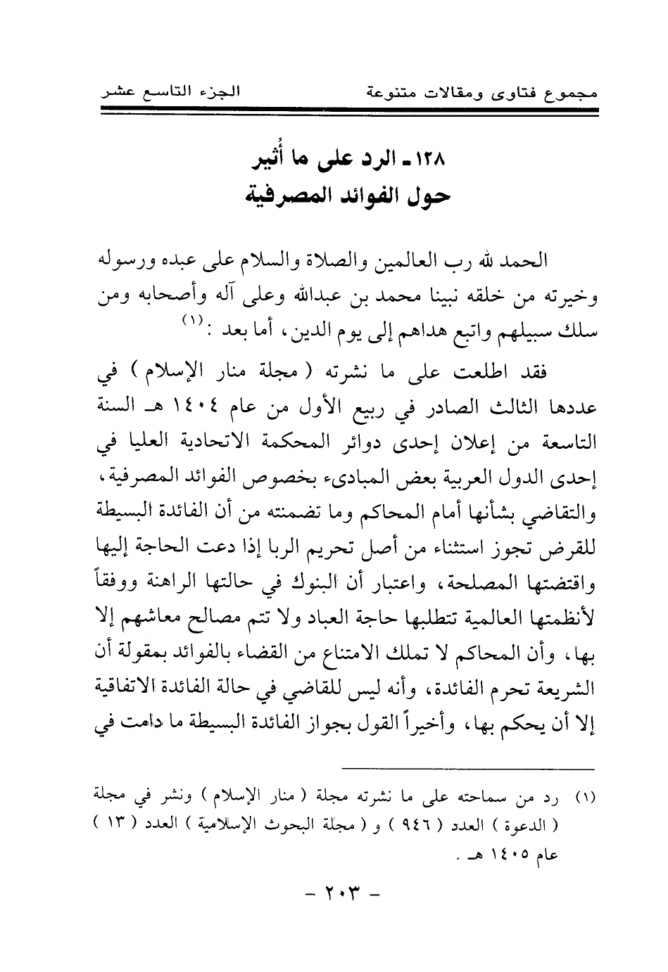 فقد اطلعت على ما نشرته (مجلة منار الإسلام) في عددها الثالث الصادر في ربيع الأول من عام 1404 هـ السنة التاسعة من إعلان إحدى دوائر المحكمة الاتحادية العليا في إحدى الدول العربية بعض المبادئ بخصوص الفوائد المصرفية، والتقاضي بشأنها أمام المحاكم، وما تضمنته من أن الفائدة البسيطة للقرض تجوز استثناء من أصل تحريم الربا إذا دعت الحاجة إليها واقتضتها المصلحة، واعتبار أن البنوك في حالتها الراهنة ووفقا لأنظمتها العالمية تتطلبها حاجة العباد، ولا تتم مصالح معاشهم إلا بها، وأن المحاكم لا تملك الامتناع من القضاء بالفوائد بمقولة: إن الشريعة تحرم الفائدة، وأنه ليس للقاضي في حالة الفائدة الاتفاقية إلا أن يحكم بها، وأخيرا القول بجواز الفائدة البسيطة ما دامت في