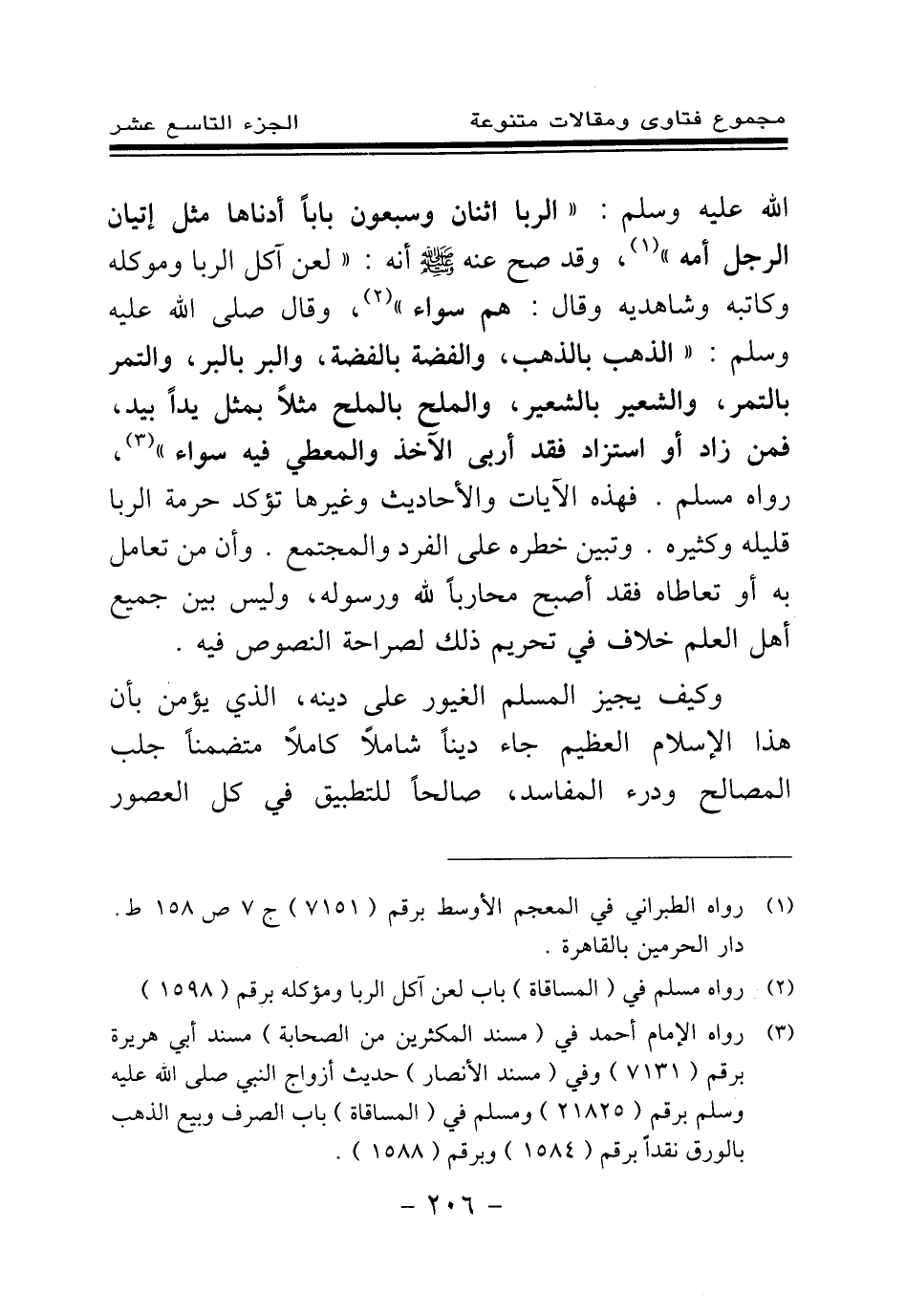 الله عليه وسلم: «الربا اثنان وسبعون بابا أدناها مثل إتيان الرجل أمه (¬1) » وقد صح عنه صلى الله عليه وسلم أنه «لعن آكل الربا وموكله وكاتبه وشاهديه وقال: هم سواء (¬2) » ، وقال صلى الله عليه وسلم: «الذهب بالذهب، والفضة بالفضة، والبر بالبر، والتمر بالتمر، والشعير بالشعير، والملح بالملح مثلا بمثل يدا بيد، فمن زاد أو استزاد فقد أربى، الآخذ والمعطي فيه سواء (¬3) » . فهذه الآيات والأحاديث وغيرها تؤكد حرمة الربا قليله وكثيره. وتبين خطره على الفرد والمجتمع، وأن من تعامل به أو تعاطاه فقد أصبح محاربا لله ورسوله، وليس بين جميع أهل العلم خلاف في تحريم ذلك لصراحة النصوص فيه.