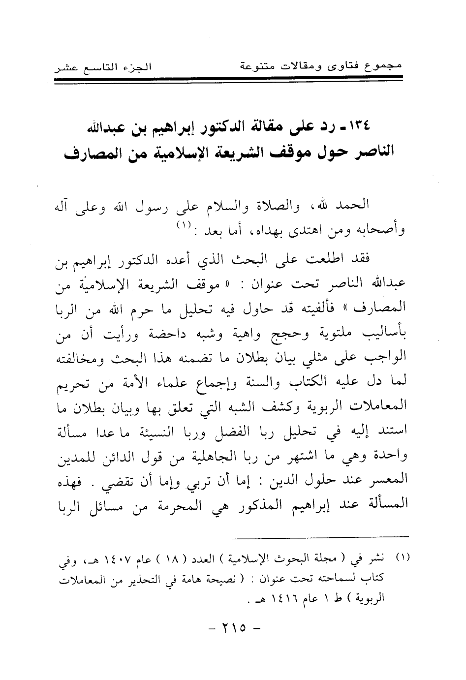 فقد اطلعت على البحث الذي أعده الدكتور إبراهيم بن عبد الله الناصر تحت عنوان (موقف الشريعة الإسلامية من المصارف) فألفيته قد حاول فيه تحليل ما حرم الله من الربا بأساليب ملتوية وحجج واهية وشبه داحضة، ورأيت أن من الواجب على مثلي بيان بطلان ما تضمنه هذا البحث ومخالفته لما دل عليه الكتاب والسنة وإحماع علماء الأمة من تحريم المعاملات الربوية، وكشف الشبهة التي تعلق بها، وبيان بطلان ما استند إليه في تحليل ربا الفضل وربا النسيئة ما عدا مسألة واحدة وهي ما اشتهر من ربا الجاهلية من قول الدائن للمدين المعسر عند حلول الدين: إما أن تربي وإما أن تقضي. فهذه المسألة عند إبراهيم المذكور هي المحرمة من مسائل الربا