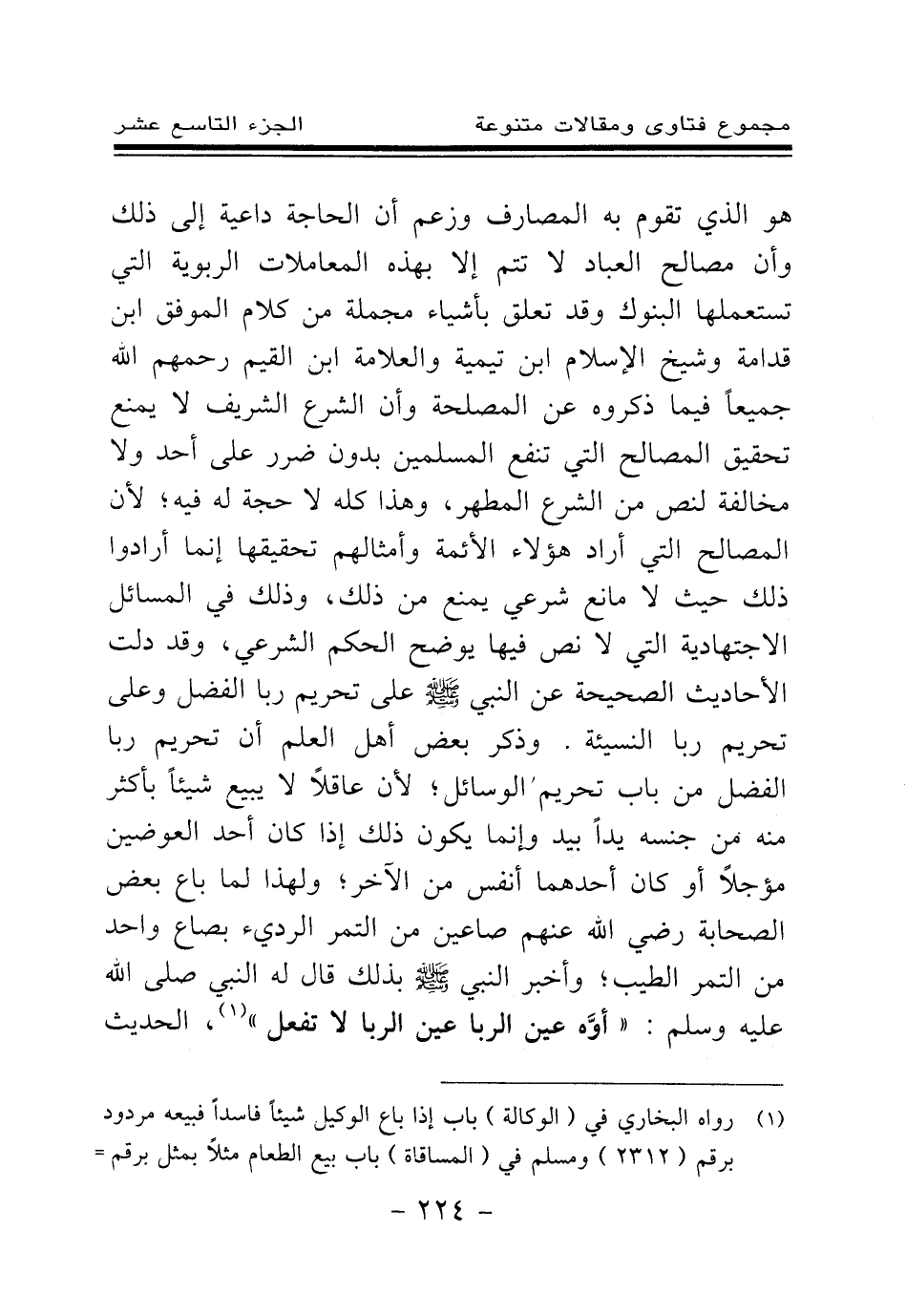 هو الذي تقوم به المصارف، وزعم أن الحاجة داعية إلى ذلك، وأن مصالح العباد لا تتم إلا بهذه المعاملات الربوية التي تستعملها البنوك، وقد تعلق بأشياء مجملة من كلام الموفق ابن قدامة وشيخ الإسلام ابن تيمية والعلامة ابن القيم رحمهم الله جميعا فيما ذكروه عن المصلحة، وأن الشرع الشريف لا يمنع تحقيق المصالح التي تنفع المسلمين بدون ضرر على أحد ولا مخالفة لنص من الشرع المطهر، وهذا كله لا حجة له فيه؛ لأن المصالح التي أراد هؤلاء الأئمة وأمثالهم تحقيقها إنما أرادوا ذلك حيث لا مانع شرعي يمنع من ذلك، وذلك في المسائل الاجتهادية التي لا نص فيها يوضح الحكم الشرعي، وقد دلت الأحاديث الصحيحة عن النبي صلى الله عليه وسلم على تحريم ربا الفضل وعلى تحريم ربا النسيئة، وذكر بعض أهل العلم أن تحريم ربا الفضل من باب تحريم الوسائل؛ لأن عاقلا لا يبيع شيئا بأكثر منه من جنسه يدا بيد، وإنما يكون ذلك إذا كان أحد العوضين مؤجلا أو كان أحدهما أنفس من الآخر، ولهذا لما باع بعض الصحابة رضي الله عنهم صاعين من التمر الرديء بصاع واحد من التمر الطيب؛ وأخبر النبي صلى الله عليه وسلم بذلك قال له النبي صلى الله عليه وسلم: «أوه عين الربا عين الربا لا تفعل (¬1) » الحديث