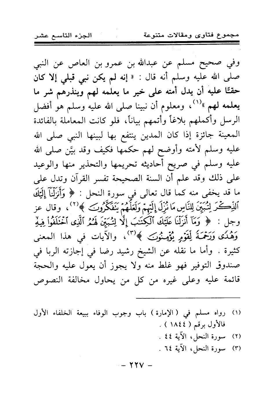 وفي صحيح مسلم عن عبد الله بن عمرو بن العاص عن النبي صلى الله عليه وسلم أنه قال: «إنه لم يكن نبي قبلي إلا كان حقا عليه أن يدل أمته على خير ما يعلمه لهم، وينذرهم شر ما يعلمه لهم (¬1) » ومعلوم أن نبينا صلى الله عليه وسلم هو أفضل الرسل وأكملهم بلاغا وأتمهم بيانا فلو كانت المعاملة بالفائدة المعينة جائزة إذا كان المدين ينتفع بها لبينها النبي صلى الله عليه وسلم لأمته وأوضح لهم حكمها، فكيف وقد بين صلى الله عليه وسلم في صريح أحاديثه تحريمها والتحذير منها والوعيد على ذلك، وقد علم أن السنة الصحيحة تفسر القرآن وتدل على ما قد يخفى منه كما قال تعالى في سورة النحل: {وَأَنْزَلْنَا إِلَيْكَ الذِّكْرَ لِتُبَيِّنَ لِلنَّاسِ مَا نُزِّلَ إِلَيْهِمْ وَلَعَلَّهُمْ يَتَفَكَّرُونَ} (¬2) وقال عز وجل: {وَمَا أَنْزَلْنَا عَلَيْكَ الْكِتَابَ إِلَّا لِتُبَيِّنَ لَهُمُ الَّذِي اخْتَلَفُوا فِيهِ وَهُدًى وَرَحْمَةً لِقَوْمٍ يُؤْمِنُونَ} (¬3) والآيات في هذا المعنى كثيرة. وأما ما نقله عن الشيخ رشيد رضا في إجازته الربا في صندوق التوفير فهو غلط منه، ولا يجوز أن يعول عليه والحجة قائمة عليه وعلى غيره من كل من يحاول مخالفة النصوص