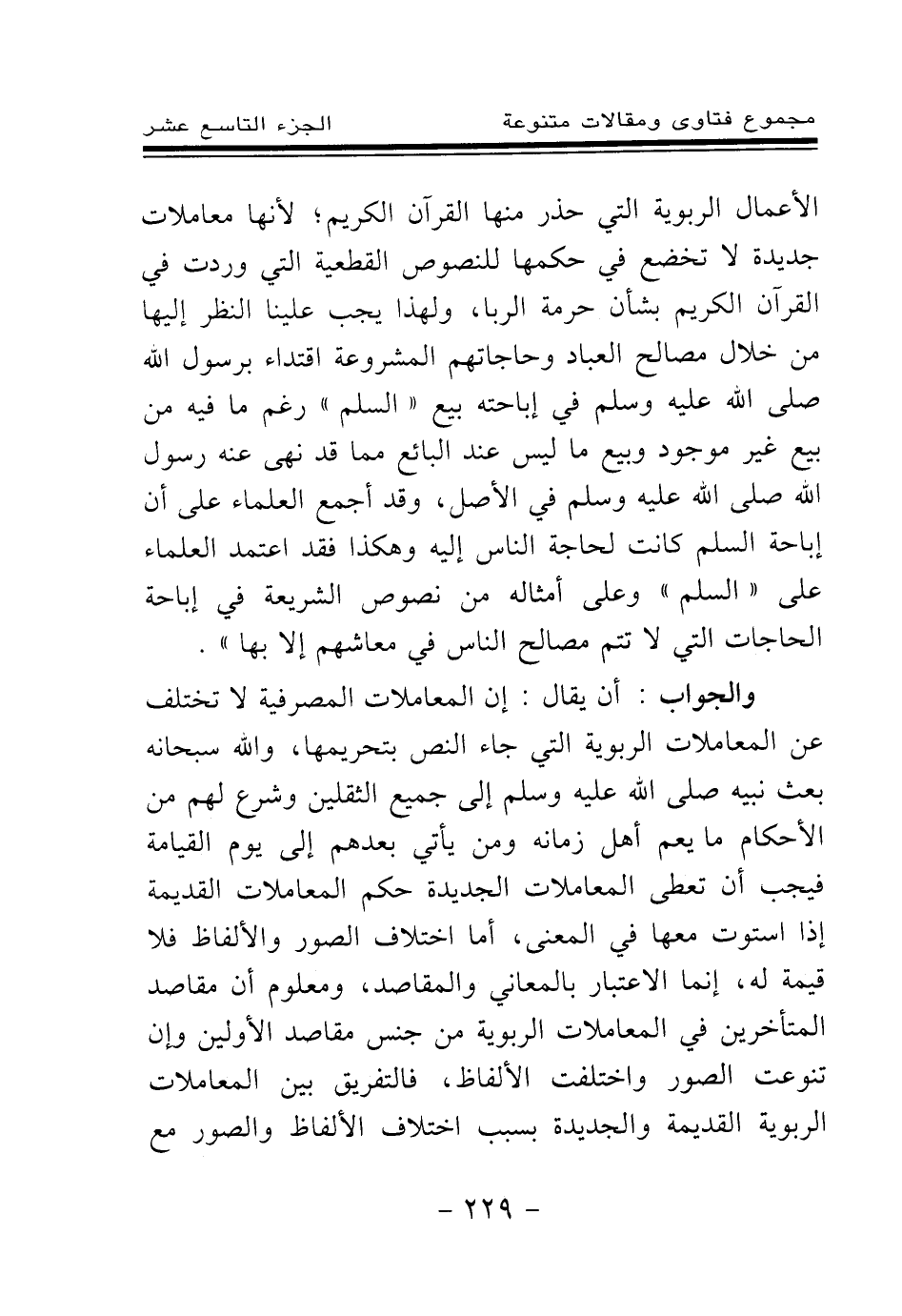 الأعمال الربوية التي حذر منها القرآن الكريم؛ لأنها معاملات جديدة لا تخضع في حكمها للنصوص القطعية التي وردت في القرآن الكريم بشأن حرمة الربا، ولهذا يجب علينا النظر إليها من خلال مصالح العباد وحاجاتهم المشروعة اقتداء برسول الله صلى الله عليه وسلم في إباحته بيع (السلم) رغم ما فيه من بيع غير موجود، وبيع ما ليس عند البائع مما قد نهى عنه رسول الله صلى الله عليه وسلم في الأصل، وقد أجمع العلماء على أن إباحة "السلم" كانت لحاجة الناس إليه، وهكذا فقد اعتمد العلماء على "السلم"