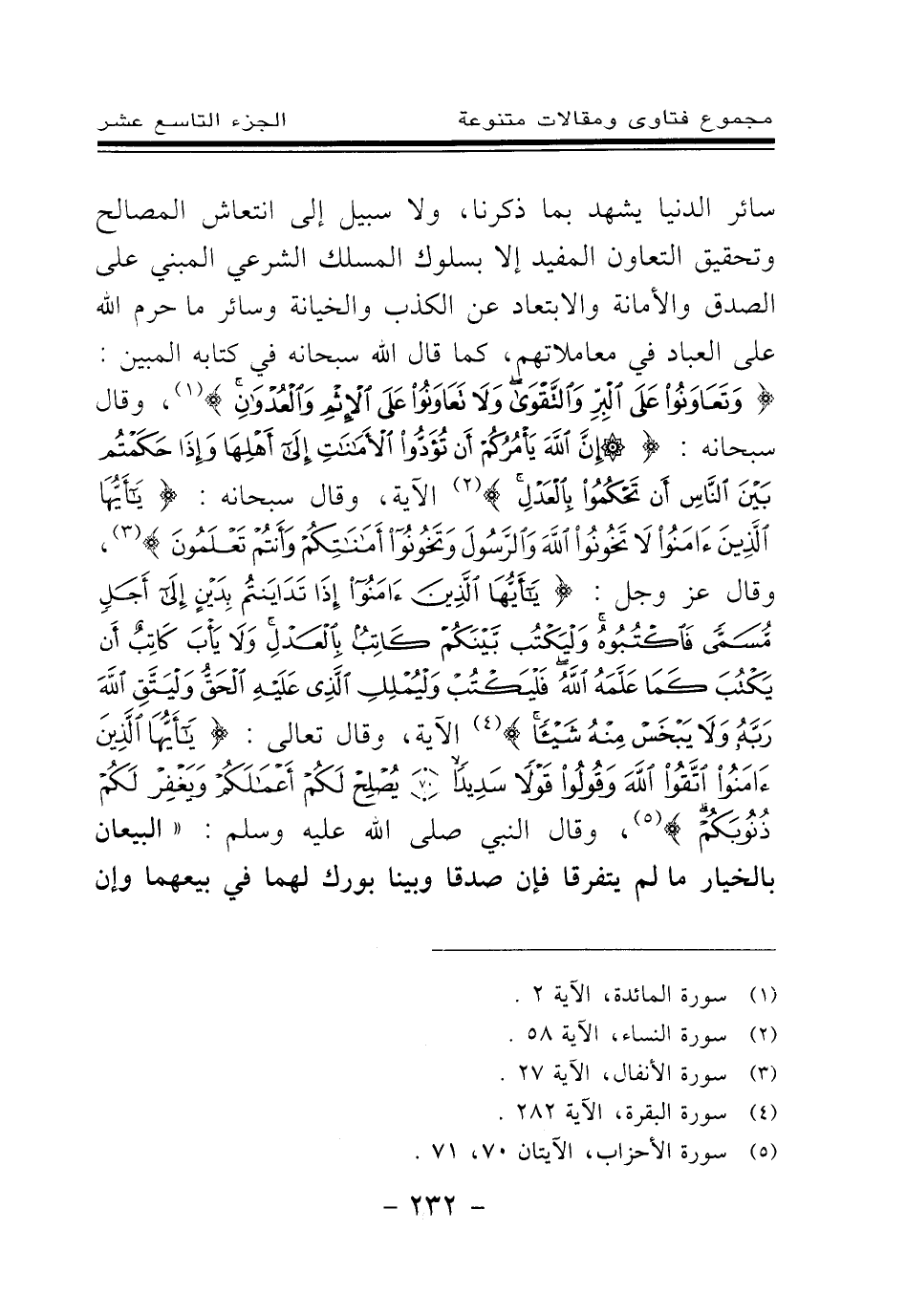 وقال عز وجل: {يَا أَيُّهَا الَّذِينَ آمَنُوا إِذَا تَدَايَنْتُمْ بِدَيْنٍ إِلَى أَجَلٍ مُسَمًّى فَاكْتُبُوهُ وَلْيَكْتُبْ بَيْنَكُمْ كَاتِبٌ بِالْعَدْلِ وَلَا يَأْبَ كَاتِبٌ أَنْ يَكْتُبَ كَمَا عَلَّمَهُ اللَّهُ فَلْيَكْتُبْ وَلْيُمْلِلِ الَّذِي عَلَيْهِ الْحَقُّ وَلْيَتَّقِ اللَّهَ رَبَّهُ وَلَا يَبْخَسْ مِنْهُ شَيْئًا} (¬4) الآية. وقال تعالى: {يَا أَيُّهَا الَّذِينَ آمَنُوا اتَّقُوا اللَّهَ وَقُولُوا قَوْلًا سَدِيدًا} (¬5) {يُصْلِحْ لَكُمْ أَعْمَالَكُمْ وَيَغْفِرْ لَكُمْ ذُنُوبَكُمْ} (¬6) وقال النبي صلى الله عليه وسلم: «البيعان بالخيار ما لم يتفرقا فإن صدقا وبينا بورك لهما في بيعهما وإن
