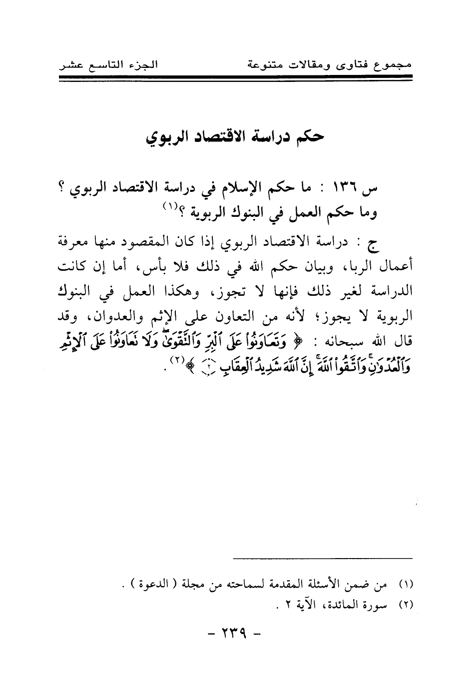 س 136: ما حكم الإسلام في دراسة الاقتصاد الربوي؟ وما حكم العمل في البنوك الربوية؟ (¬1) .