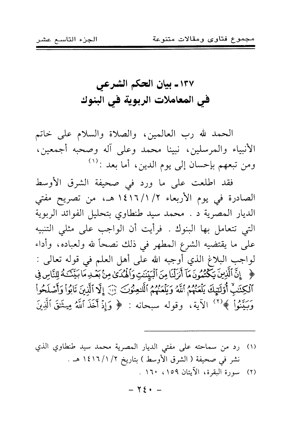 فقد اطلعت على ما ورد في صحيفة الشرق الأوسط الصادرة في يوم الأربعاء 2\1\1416هـ، من تصريح مفتي الديار المصرية د. محمد سيد طنطاوي بتحليل الفوائد الربوية التي تتعامل بها البنوك. فرأيت أن الواجب على مثلي التنبيه على ما يقتضيه الشرع المطهر في ذلك نصحا لله ولعباده، وأداء لواجب البلاغ الذي أوجبه الله على أهل العلم في قوله تعالى: {إِنَّ الَّذِينَ يَكْتُمُونَ مَا أَنْزَلْنَا مِنَ الْبَيِّنَاتِ وَالْهُدَى مِنْ بَعْدِ مَا بَيَّنَّاهُ لِلنَّاسِ فِي الْكِتَابِ أُولَئِكَ يَلْعَنُهُمُ اللَّهُ وَيَلْعَنُهُمُ اللَّاعِنُونَ} (¬1) {إِلَّا الَّذِينَ تَابُوا وَأَصْلَحُوا وَبَيَّنُوا} (¬2) الآية، وقوله سبحانه: {وَإِذْ أَخَذَ اللَّهُ مِيثَاقَ الَّذِينَ أُوتُوا الْكِتَابَ لَتُبَيِّنُنَّهُ لِلنَّاسِ وَلَا تَكْتُمُونَهُ} (¬3)