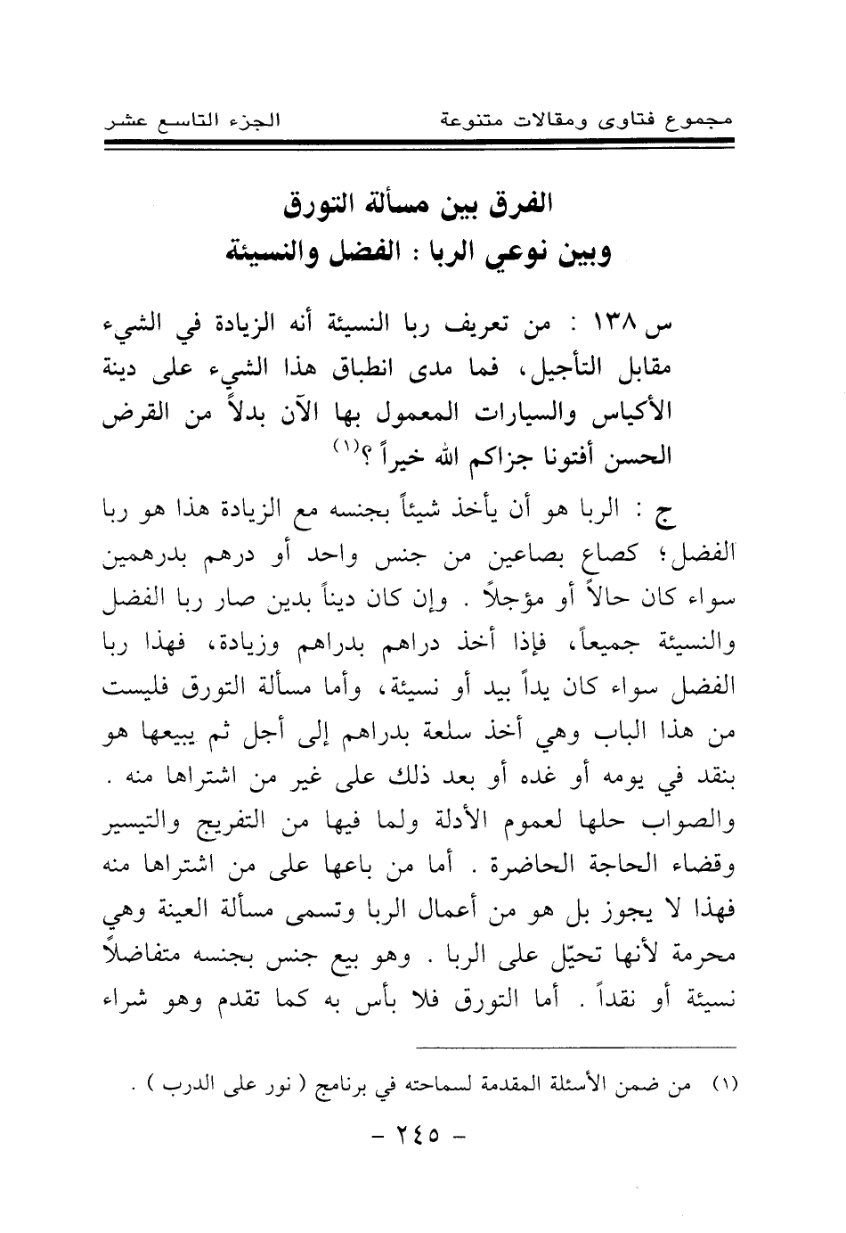 س 138: من تعريف ربا النسيئة أنه الزيادة في الشيء مقابل التأجيل، فما مدى انطباق هذا الشيء على دينة الأكياس والسيارات المعمول بها الآن بدلا من القرض الحسن أفتونا جزاكم الله خيرا؟ (¬1) . ج: الربا هو أن يأخذ شيئا بجنسه مع الزيادة هذا هو ربا الفضل؛ كصاع بصاعين من جنس واحد أو درهم بدرهمين سواء كان حالا أو مؤجلا. وإن كان دينا بدين صار ربا الفضل والنسيئة جميعا، فإذا أخذ دراهم بدراهم وزيادة، فهذا ربا الفضل سواء كان يدا بيد أو نسيئة، وأما مسألة التورق فليست من هذا الباب وهي أخذ سلعة بدراهم إلى أجل ثم يبيعها هو بنقد في يومه أو غده أو بعد ذلك على غير من اشتراها منه.
