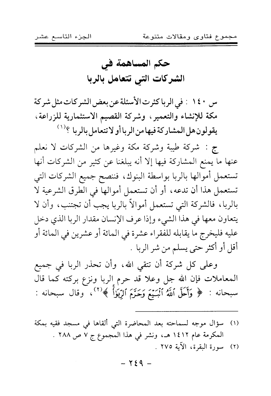 س 140: في الربا كثرت الأسئلة عن بعض الشركات مثل شركة مكة للإنشاء والتعمير، وشركة القصيم الاستثمارية للزراعة، يقولون هل المشاركة فيها من الربا أو لا تتعامل بالربا؟ .