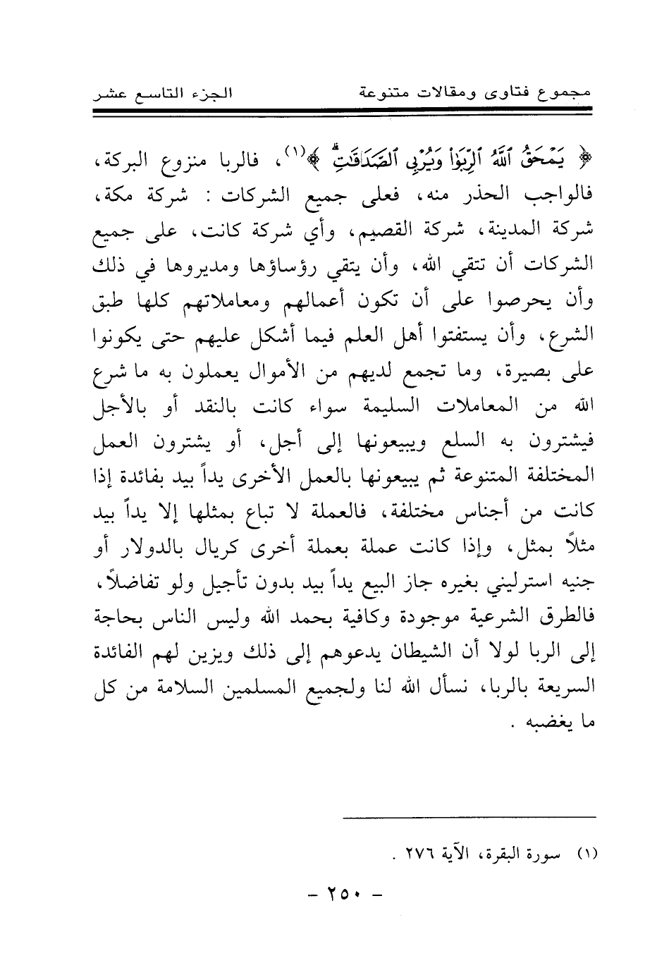 فالربا منزوع البركة، فالواجب الحذر منه، فعلى جميع الشركات: شركة مكة، شركة المدينة، شركة القصيم، وأي شركة كانت، على جميع الشركات أن تتقي الله، وأن يتقي رؤساؤها ومديروها في ذلك وأن يحرصوا على أن تكون أعمالهم ومعاملاتهم كلها طبق الشرع، وأن يستفتوا أهل العلم فيما أشكل عليهم حتى يكونوا على بصيرة، وما تجمع لديهم من الأموال يعملون به ما شرع الله من المعاملات السليمة سواء كانت بالنقد أو بالأجل فيشترون به السلع ويبيعونها إلى أجل، أو يشترون العمل المختلفة المتنوعة ثم يبيعونها بالعمل الأخرى يدا بيد بفائدة إذا كانت من أجناس مختلفة، فالعملة لا تباع بمثلها إلا يدا بيد مثلا بمثل، وإذا كانت عملة بعملة أخرى كريال بالدولار أو جنيه استرليني بغيره جاز البيع يدا بيد بدون تأجيل ولو تفاضلا، فالطرق الشرعية موجودة وكافية بحمد الله وليس الناس بحاجة إلى الربا لولا أن الشيطان يدعوهم إلى ذلك ويزين لهم الفائدة السريعة بالربا، نسأل الله لنا ولجميع المسلمين السلامة من كل ما يغضبه.