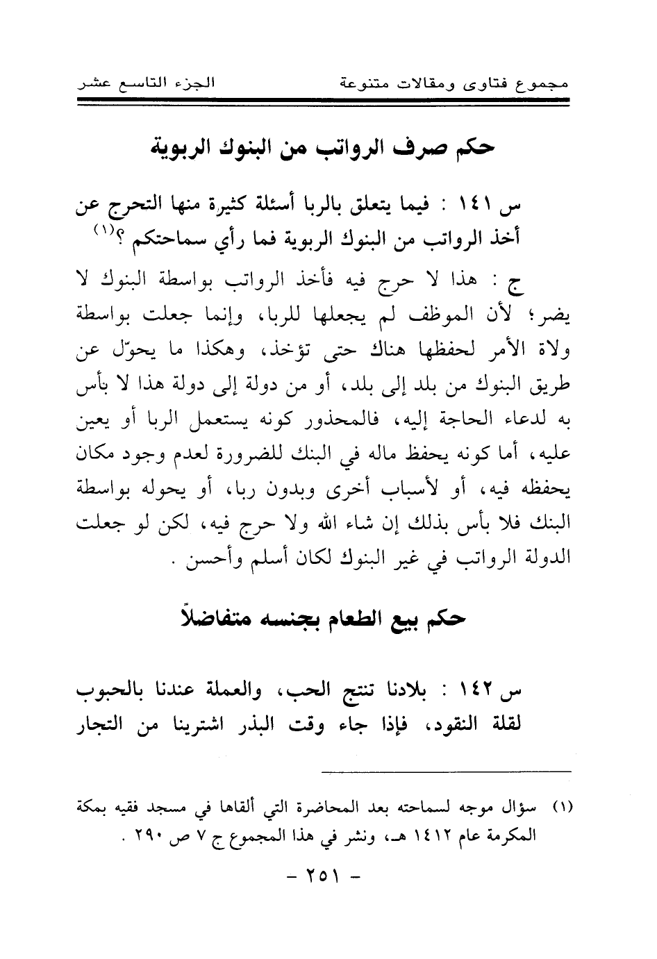 ج: هذا لا حرج فيه فأخذ الرواتب بواسطة البنوك لا يضر؛ لأن الموظف لم يجعلها للربا، وإنما جعلت بواسطة ولاة الأمر لحفظها هناك حتى تؤخذ، وهكذا ما يحول عن طريق البنوك من بلد إلى بلد، أو من دولة إلى دولة هذا لا بأس به لدعاء الحاجة إليه، فالمحذور كونه يستعمل الربا أو يعين عليه، أما كونه يحفظ ماله في البنك للضرورة لعدم وجود مكان يحفظه فيه، أو لأسباب أخرى وبدون ربا، أو يحوله بواسطة البنك فلا بأس بذلك إن شاء الله ولا حرج فيه، لكن لو جعلت الدولة الرواتب في غير البنوك لكان أسلم وأحسن.