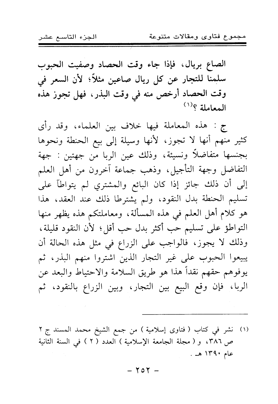 الصاع بريال، فإذا جاء وقت الحصاد وصفيت الحبوب سلمنا للتجار عن كل ريال صاعين مثلا؛ لأن السعر في وقت الحصاد أرخص منه في وقت البذر، فهل تجوز هذه المعاملة؟ .
