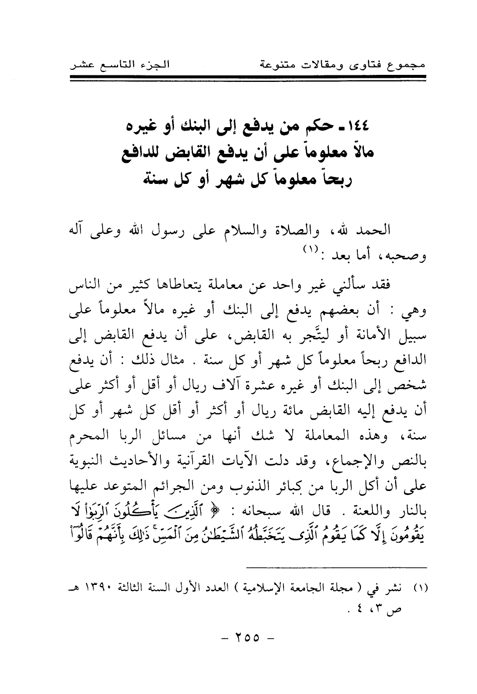 فقد سألني غير واحد عن معاملة يتعاطاها كثير من الناس وهي: أن بعضهم يدفع إلى البنك أو غيره مالا معلوما على سبيل الأمانة أو ليتجر به القابض، على أن يدفع القابض إلى الدافع ربحا معلوما كل شهر أو كل سنة. مثال ذلك: أن يدفع شخص إلى البنك أو غيره عشرة آلاف ريال أو أقل أو أكثر على أن يدفع إليه القابض مائة ريال أو أكثر أو أقل كل شهر أو كل سنة، وهذه المعاملة لا شك أنها من مسائل الربا المحرم بالنص والإجماع، وقد دلت الآيات القرآنية والأحاديث النبوية على أن أكل الربا من كبائر الذنوب ومن الجرائم المتوعد عليها بالنار واللعنة. قال الله سبحانه: {الَّذِينَ يَأْكُلُونَ الرِّبَا لَا يَقُومُونَ إِلَّا كَمَا يَقُومُ الَّذِي يَتَخَبَّطُهُ الشَّيْطَانُ مِنَ الْمَسِّ ذَلِكَ بِأَنَّهُمْ قَالُوا إِنَّمَا الْبَيْعُ مِثْلُ الرِّبَا وَأَحَلَّ اللَّهُ الْبَيْعَ وَحَرَّمَ الرِّبَا فَمَنْ جَاءَهُ مَوْعِظَةٌ مِنْ رَبِّهِ فَانْتَهَى فَلَهُ مَا سَلَفَ وَأَمْرُهُ إِلَى اللَّهِ وَمَنْ عَادَ فَأُولَئِكَ أَصْحَابُ النَّارِ هُمْ فِيهَا خَالِدُونَ} (¬2) {يَمْحَقُ اللَّهُ الرِّبَا وَيُرْبِي الصَّدَقَاتِ وَاللَّهُ لَا يُحِبُّ كُلَّ كَفَّارٍ أَثِيمٍ} (¬3)