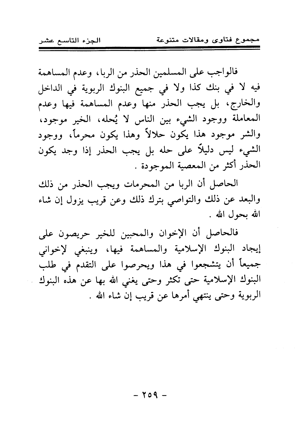 فالحاصل أن الإخوان والمحبين للخير حريصون على إيجاد البنوك الإسلامية والمساهمة فيها، وينبغي لإخواني جميعا أن يتشجعوا في هذا ويحرصوا على التقدم في طلب البنوك الإسلامية حتى تكثر وحتى يغني الله بها عن هذه البنوك الربوية وحتى ينتهي أمرها عن قريب إن شاء الله.