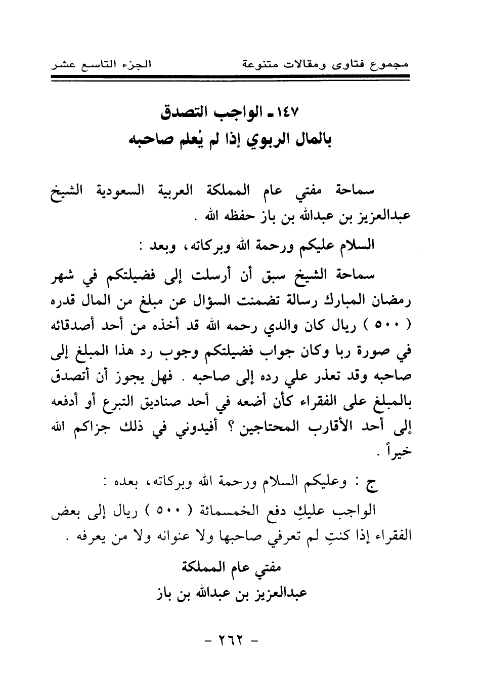 147 - الواجب التصدق بالمال الربوي إذا لم يعلم صاحبه