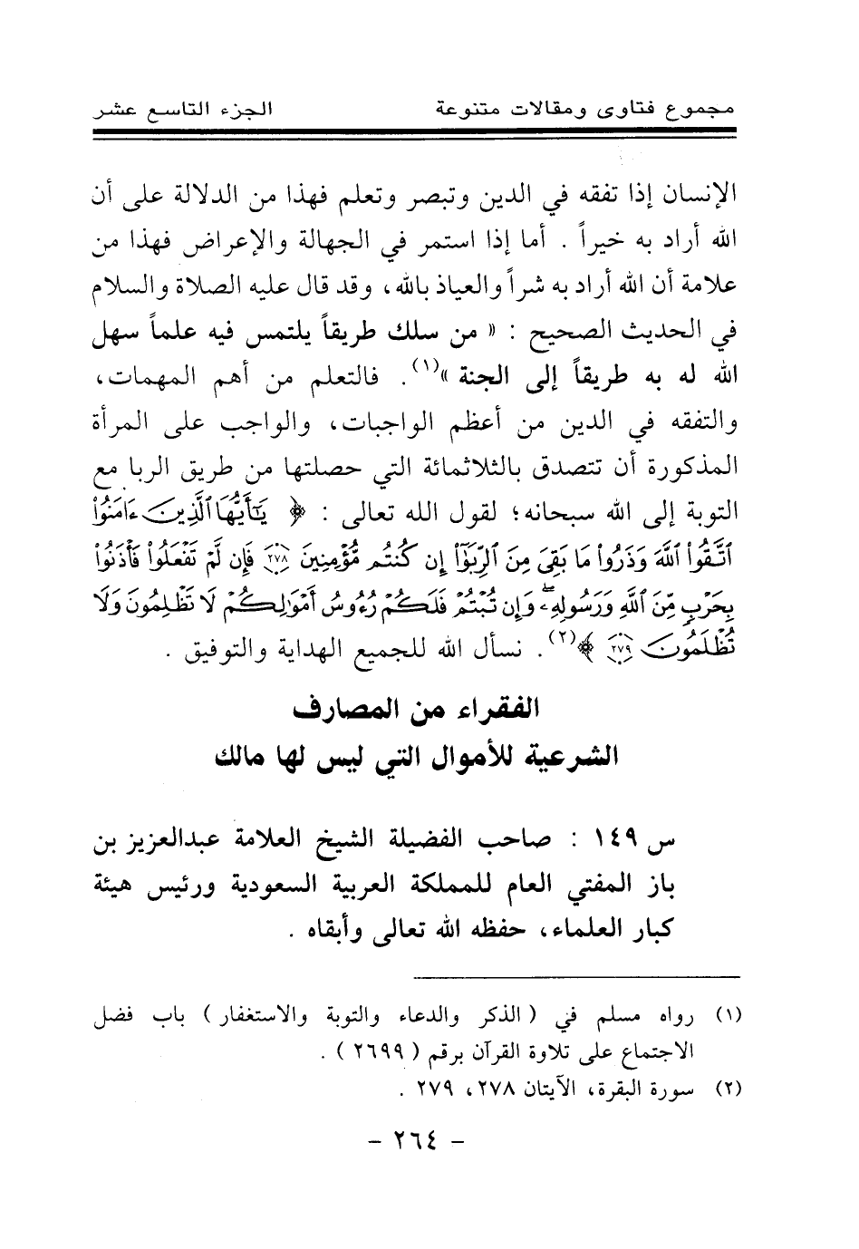 الإنسان إذا تفقه في الدين وتبصر وتعلم فهذا من الدلالة على أن الله أراد به خيرا. أما إذا استمر في الجهالة والإعراض فهذا من علامة أن الله أراد به شرا والعياذ بالله، وقد قال عليه الصلاة والسلام في الحديث الصحيح: «من سلك طريقا يلتمس فيه علما سهل الله له به طريقا للجنة (¬1) » . فالتعلم من أهم المهمات، والتفقه في الدين من أعظم الواجبات، والواجب على المرأة المذكورة أن تتصدق بالثلاثمائة التي حصلتها من طريق الربا مع التوبة إلى الله سبحانه؛ لقول الله تعالى: {يَا أَيُّهَا الَّذِينَ آمَنُوا اتَّقُوا اللَّهَ وَذَرُوا مَا بَقِيَ مِنَ الرِّبَا إِنْ كُنْتُمْ مُؤْمِنِينَ} (¬2) {فَإِنْ لَمْ تَفْعَلُوا فَأْذَنُوا بِحَرْبٍ مِنَ اللَّهِ وَرَسُولِهِ وَإِنْ تُبْتُمْ فَلَكُمْ رُءُوسُ أَمْوَالِكُمْ لَا تَظْلِمُونَ وَلَا تُظْلَمُونَ} (¬3) نسأل الله للجميع الهداية والتوفيق.