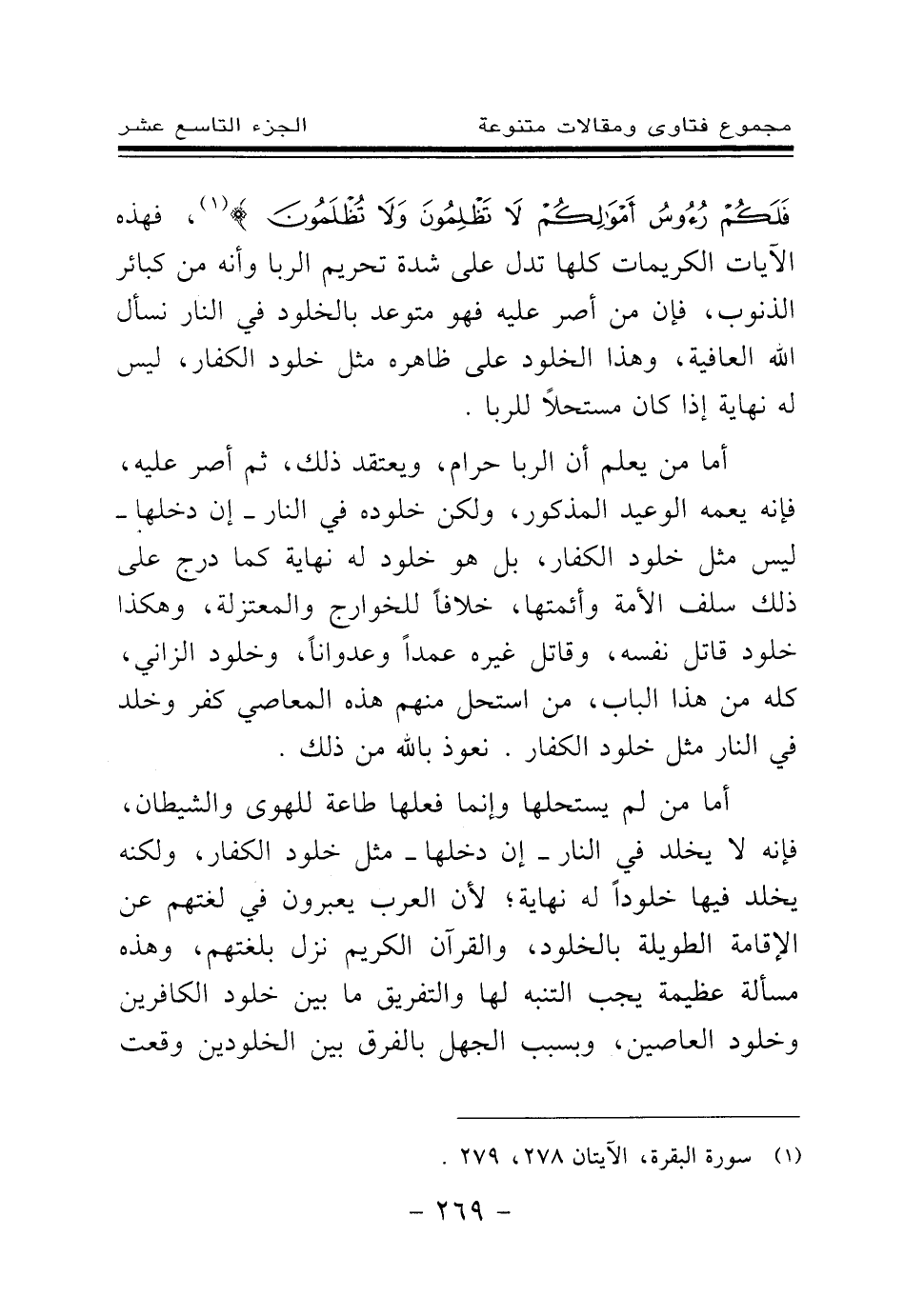 أما من يعلم أن الربا حرام، ويعتقد ذلك، ثم أصر عليه، فإنه يعمه الوعيد المذكور، ولكن خلوده في النار - إن دخلها- ليس مثل خلود الكفار، بل هو خلود له نهاية كما درج على ذلك سلف الأمة وأئمتها، خلافا للخوارج والمعتزلة، وهكذا خلود قاتل نفسه، وقاتل غيره عمدا وعدوانا، وخلود الزاني، كله من هذا الباب، من استحل منهم هذه المعاصي كفر وخلد في النار مثل خلود الكفار. نعوذ بالله من ذلك.