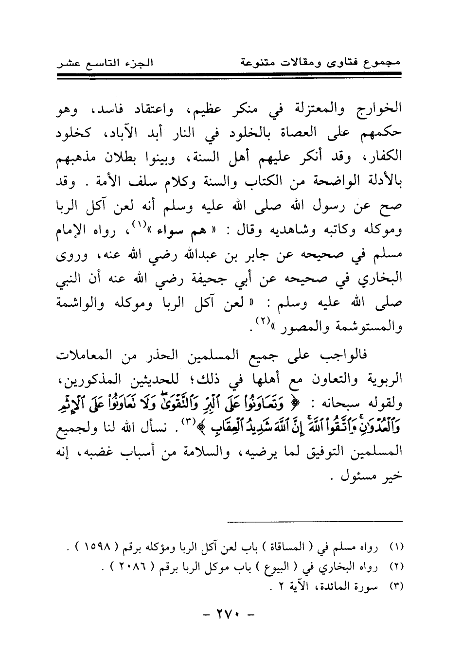 فالواجب على جميع المسلمين الحذر من المعاملات الربوية والتعاون مع أهلها في ذلك؛ للحديثين المذكورين، ولقوله سبحانه: {وَتَعَاوَنُوا عَلَى الْبِرِّ وَالتَّقْوَى وَلَا تَعَاوَنُوا عَلَى الْإِثْمِ وَالْعُدْوَانِ وَاتَّقُوا اللَّهَ إِنَّ اللَّهَ شَدِيدُ الْعِقَابِ} (¬3) نسأل الله لنا ولجميع المسلمين التوفيق لما يرضيه، والسلامة من أسباب غضبه، إنه خير مسئول.