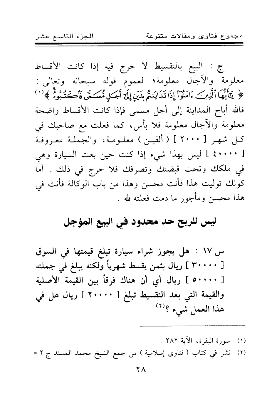 س 17: هل يجوز شراء سيارة تبلغ قيمتها في السوق (30000) ريال بثمن يقسط شهريا ولكنه يبلغ في جملته (50000) ريال أي أن هناك فرقا بين القيمة الأصلية والقيمة التي بعد التقسيط تبلغ (20000) ريال هل في هذا العمل شيء؟ (¬1) .