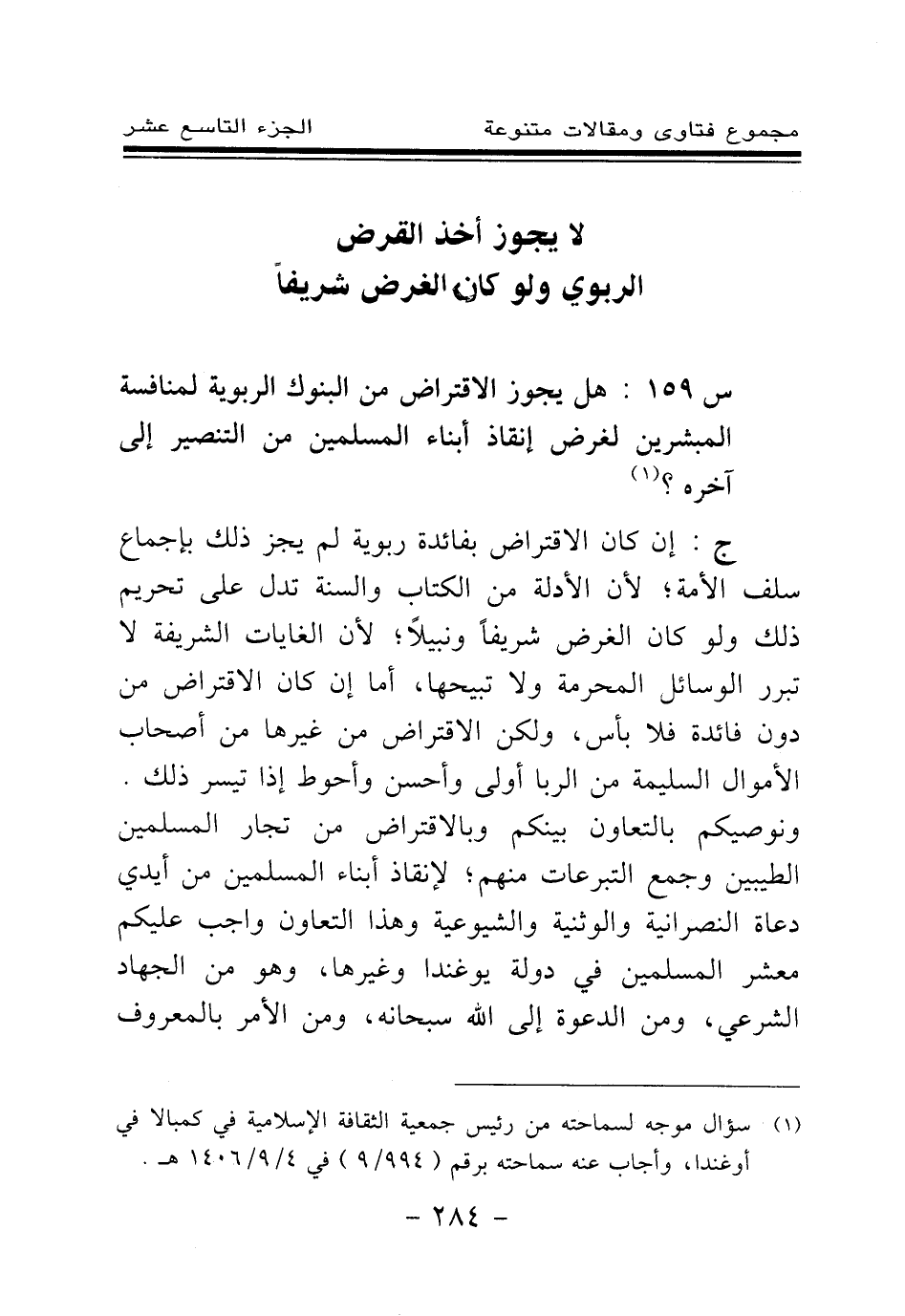 س 159: هل يجوز الاقتراض من البنوك الربوية لمنافسة المبشرين لغرض إنقاذ أبناء المسلمين من التنصير إلى آخره؟ .