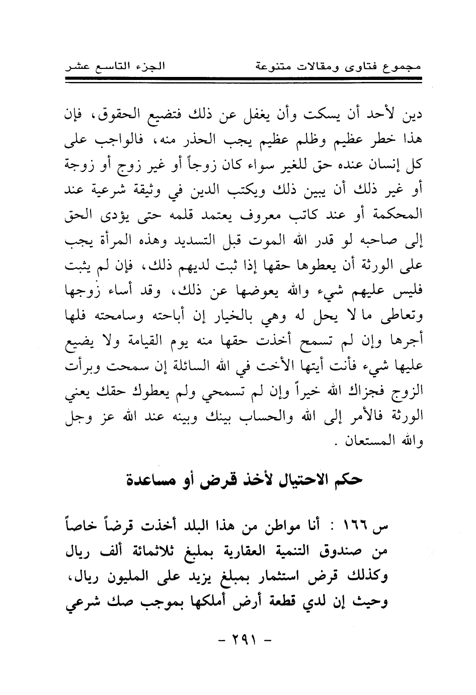 س 166: أنا مواطن من هذا البلد أخذت قرضا خاصا من صندوق التنمية العقارية بمبلغ ثلاثمائة ألف ريال وكذلك قرض استثمار بمبلغ يزيد على المليون ريال، وحيث إن لدي قطعة أرض أملكها بموجب صك شرعي