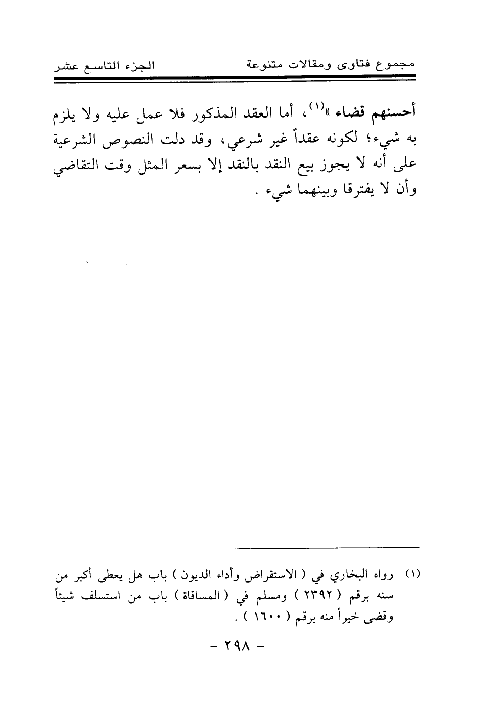 أحسنهم قضاء (¬1) » ، أما العقد المذكور فلا عمل عليه ولا يلزم به شيء؛ لكونه عقدا غير شرعي، وقد دلت النصوص الشرعية على أنه لا يجوز بيع النقد بالنقد إلا بسعر المثل وقت التقاضي وأن لا يفترقا وبينهما شيء.