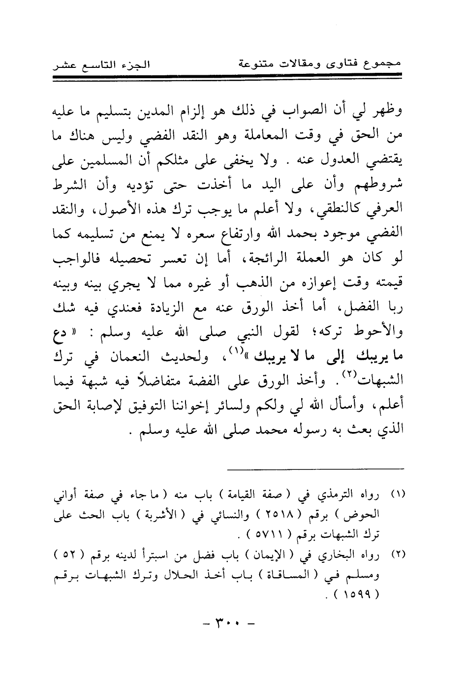 وظهر لي أن الصواب في ذلك هو إلزام المدين بتسليم ما عليه من الحق في وقت المعاملة وهو النقد الفضي وليس هناك ما يقتضي العدول عنه. ولا يخفى على مثلكم أن المسلمين على شروطهم وأن على اليد ما أخذت حتى تؤديه وأن الشرط العرفي كالنطقي، ولا أعلم ما يوجب ترك هذه الأصول، والنقد الفضي موجود بحمد الله وارتفاع سعره لا يمنع من تسليمه كما لو كان هو العملة الرائجة، أما إن تعسر تحصيله فالواجب قيمته وقت إعوازه من الذهب أو غيره مما لا يجري بينه وبينه ربا الفضل، أما أخذ الورق عنه مع الزيادة فعندي فيه شك والأحوط تركه؛ لقول النبي صلى الله عليه وسلم: «دع ما يريبك إلى ما لا يريبك (¬1) » ، ولحديث النعمان في ترك الشبهات. وأخذ الورق على الفضة متفاضلا فيه شبهة فيما أعلم، وأسأل الله لي ولكم ولسائر إخواننا التوفيق لإصابة الحق الذي بعث به رسوله محمد صلى الله عليه وسلم.