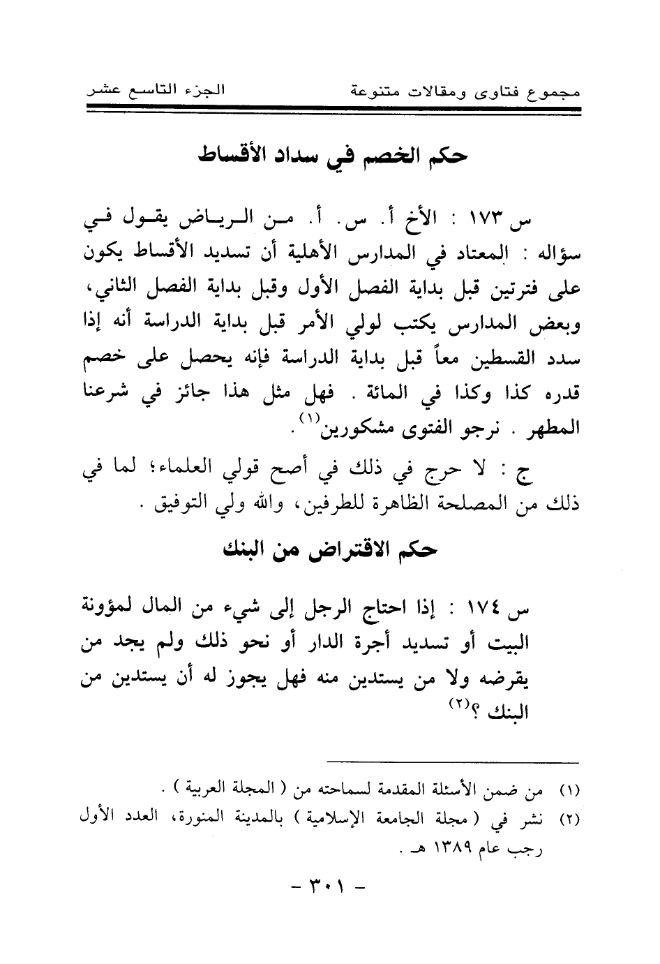 س 174: إذا احتاج الرجل إلى شيء من المال لمؤونة البيت أو تسديد أجرة الدار أو نحو ذلك ولم يجد من يقرضه ولا من يستدين منه فهل يجوز له أن يستدين من البنك؟ (¬1) .