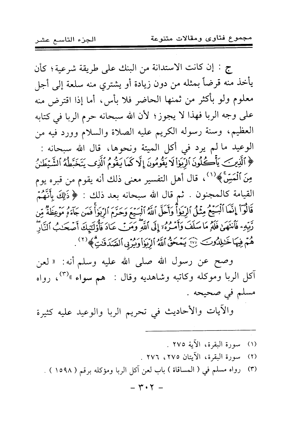 ج: إن كانت الاستدانة من البنك على طريقة شرعية؛ كأن يأخذ منه قرضا بمثله من دون زيادة أو يشتري منه سلعة إلى أجل معلوم ولو بأكثر من ثمنها الحاضر فلا بأس، أما إذا اقترض منه على وجه الربا فهذا لا يجوز؛ لأن الله سبحانه حرم الربا في كتابه العظيم، وسنه رسوله الكريم عليه الصلاة والسلام وورد فيه من الوعيد ما لم يرد في أكل الميتة، ونحوها، قال الله سبحانه: {الَّذِينَ يَأْكُلُونَ الرِّبَا لَا يَقُومُونَ إِلَّا كَمَا يَقُومُ الَّذِي يَتَخَبَّطُهُ الشَّيْطَانُ مِنَ الْمَسِّ} (¬1) قال أهل التفسير معنى ذلك أنه يقوم من قبره يوم القيامة كالمجنون. ثم قال الله سبحانه بعد ذلك: {ذَلِكَ بِأَنَّهُمْ قَالُوا إِنَّمَا الْبَيْعُ مِثْلُ الرِّبَا وَأَحَلَّ اللَّهُ الْبَيْعَ وَحَرَّمَ الرِّبَا فَمَنْ جَاءَهُ مَوْعِظَةٌ مِنْ رَبِّهِ فَانْتَهَى فَلَهُ مَا سَلَفَ وَأَمْرُهُ إِلَى اللَّهِ وَمَنْ عَادَ فَأُولَئِكَ أَصْحَابُ النَّارِ هُمْ فِيهَا خَالِدُونَ} (¬2) {يَمْحَقُ اللَّهُ الرِّبَا وَيُرْبِي الصَّدَقَاتِ} (¬3)