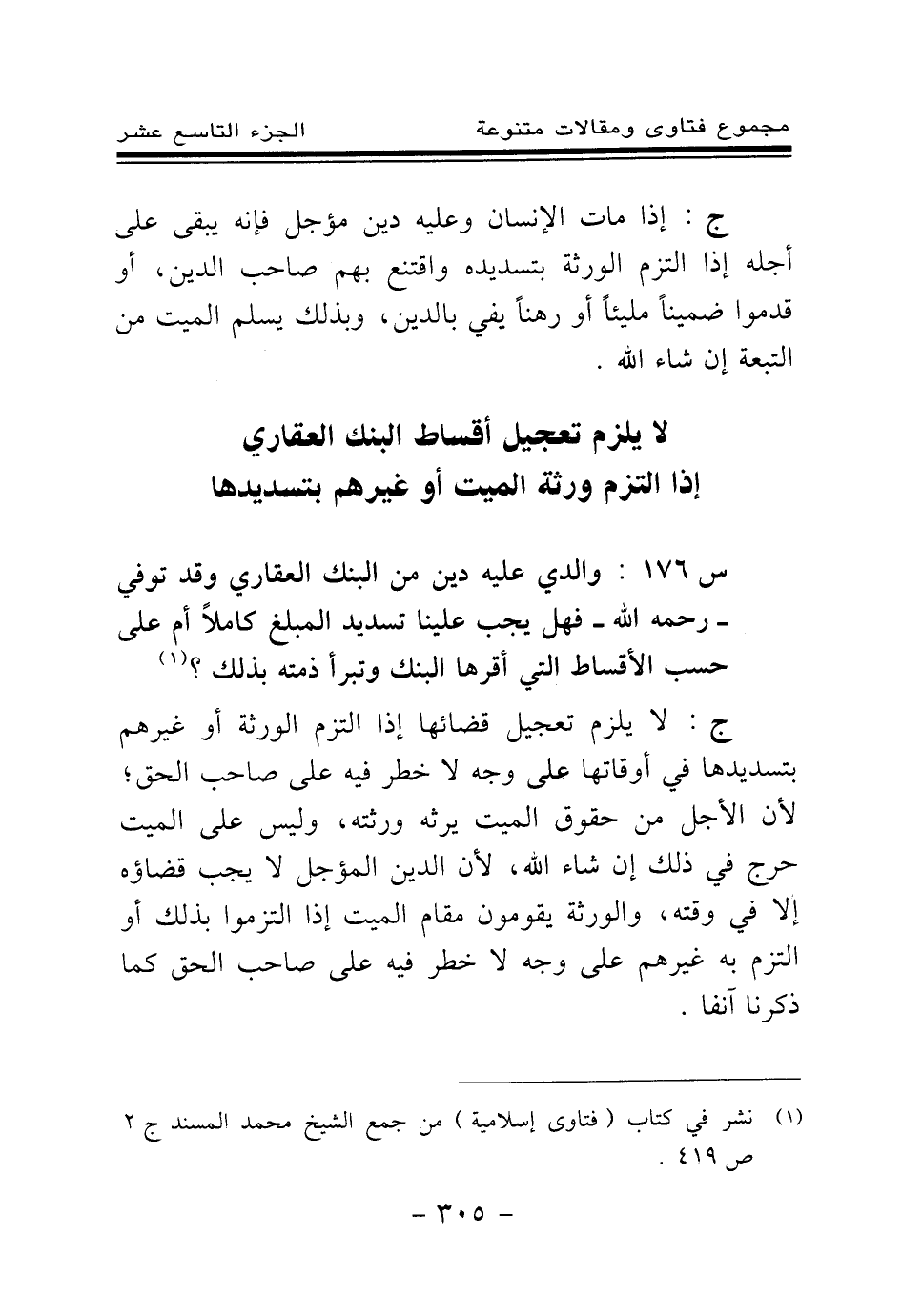 س 176: والدي عليه دين من البنك العقاري وقد توفي - رحمه الله - فهل يجب علينا تسديد المبلغ كاملا أم على حسب الأقساط التي أقرها البنك وتبرأ ذمته بذلك؟ (¬1) .