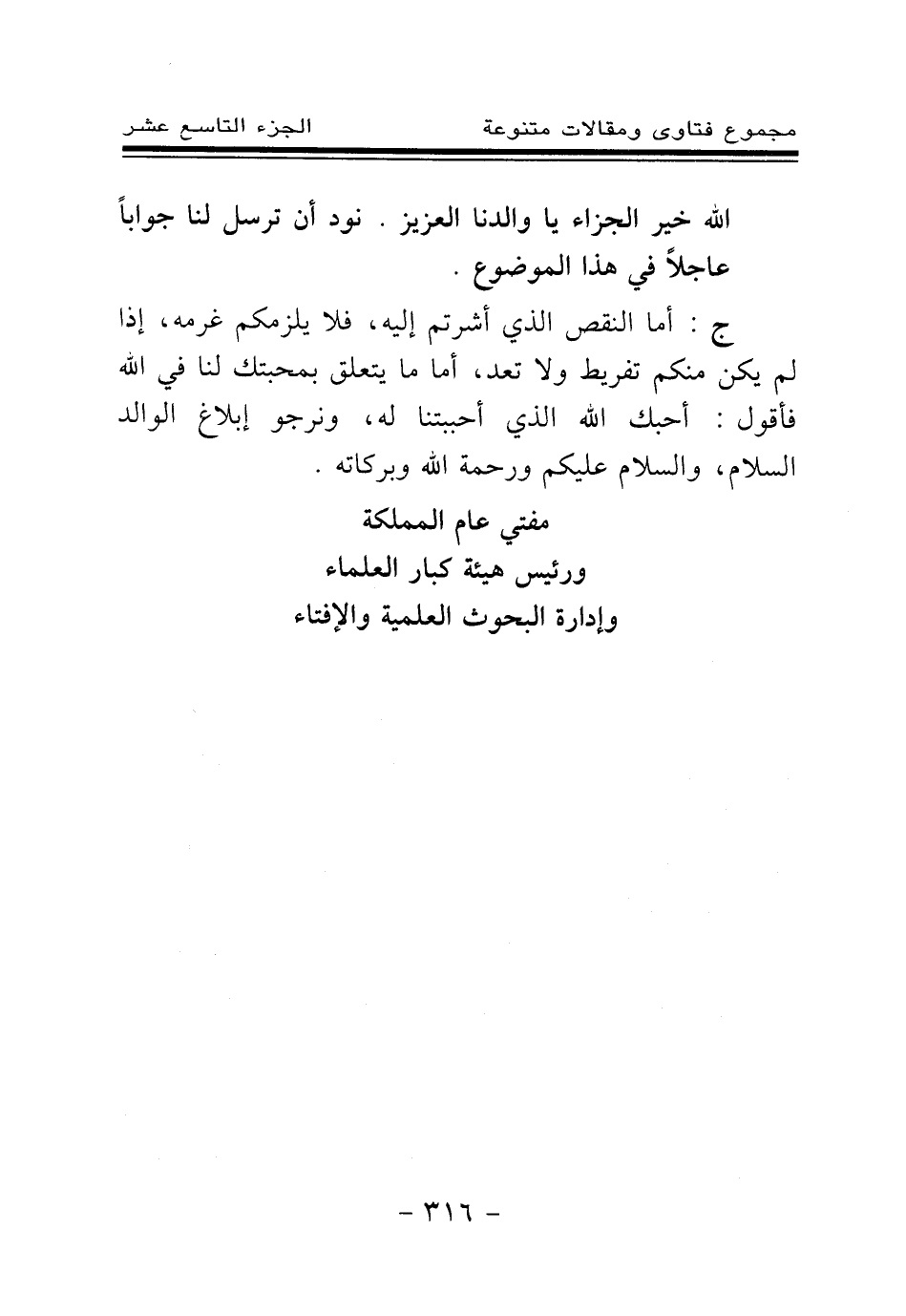 ج: أما النقص الذي أشرتم إليه، فلا يلزمكم غرمه، إذا لم يكن منكم تفريط ولا تعد، أما ما يتعلق بمحبتك لنا في الله فأقول: أحبك الله الذي أحببتنا له، ونرجو إبلاغ الوالد السلام، والسلام عليكم ورحمة الله وبركاته.