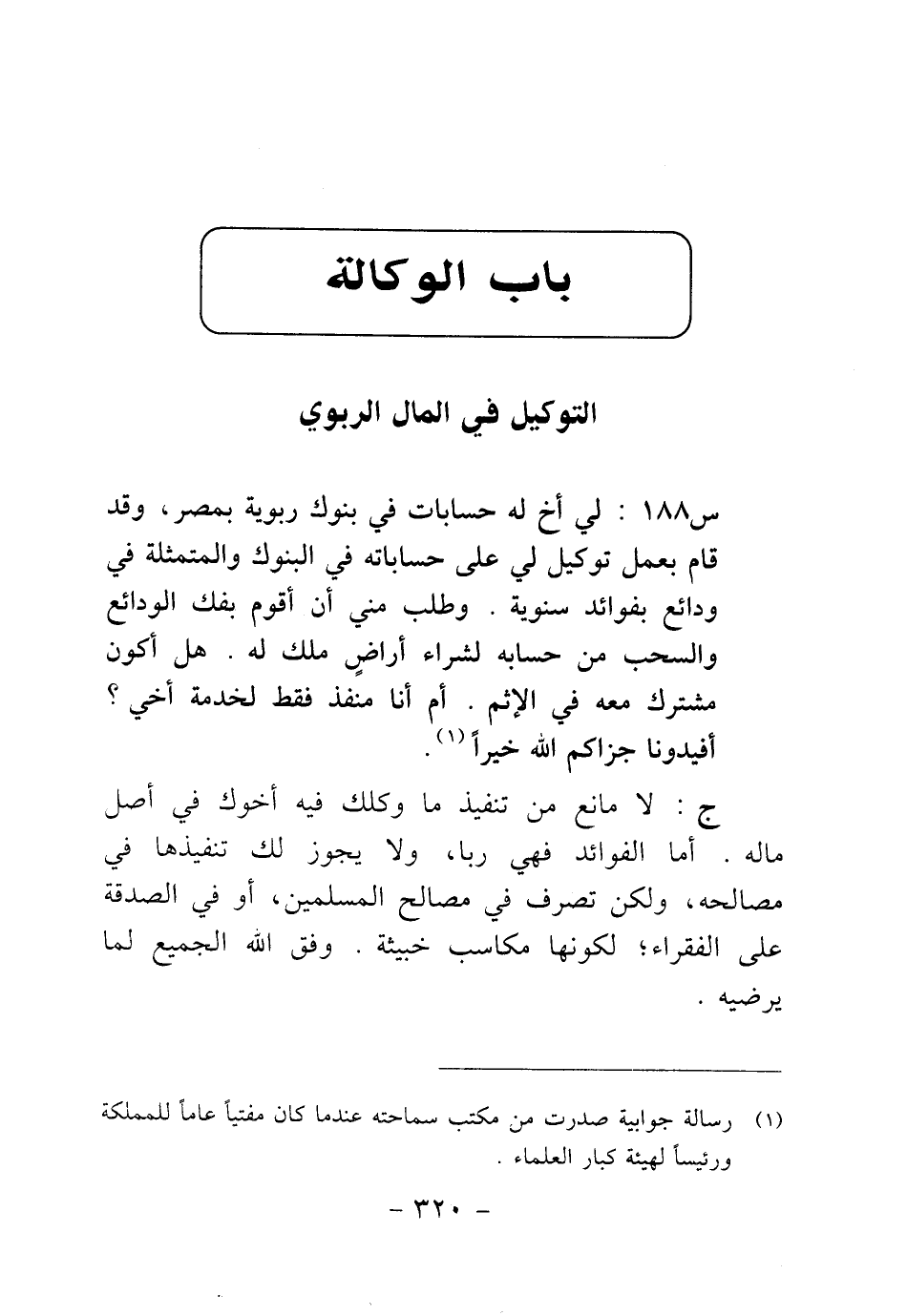س 188: لي أخ له حسابات في بنوك ربوية بمصر، وقد قام بعمل توكيل لي على حساباته في البنوك والمتمثلة في ودائع بفوائد سنوية. وطلب مني أن أقوم بفك الودائع والسحب من حسابه لشراء أراض ملك له. هل أكون مشترك معه في الإثم. أم أنا منفذ فقط لخدمة أخي؟ أفيدونا جزاكم الله خيرا (¬1) .