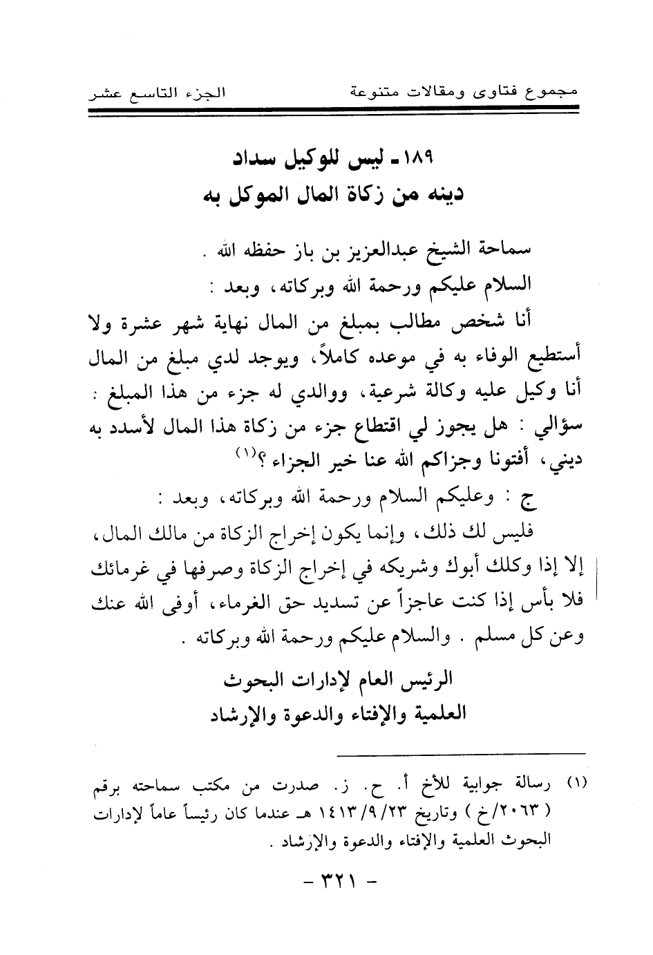 189 - ليس للوكيل سداد دينه من زكاة المال الموكل به