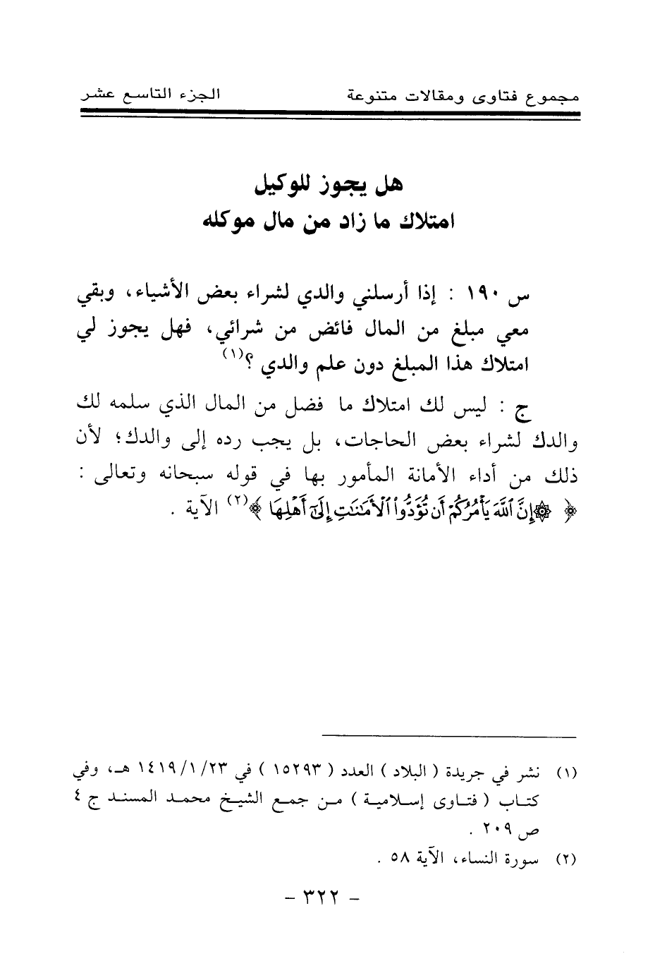 س 190: إذا أرسلني والدي لشراء بعض الأشياء، وبقي معي مبلغ من المال فائض من شرائي، فهل يجوز لي امتلاك هذا المبلغ دون علم والدي؟ .
