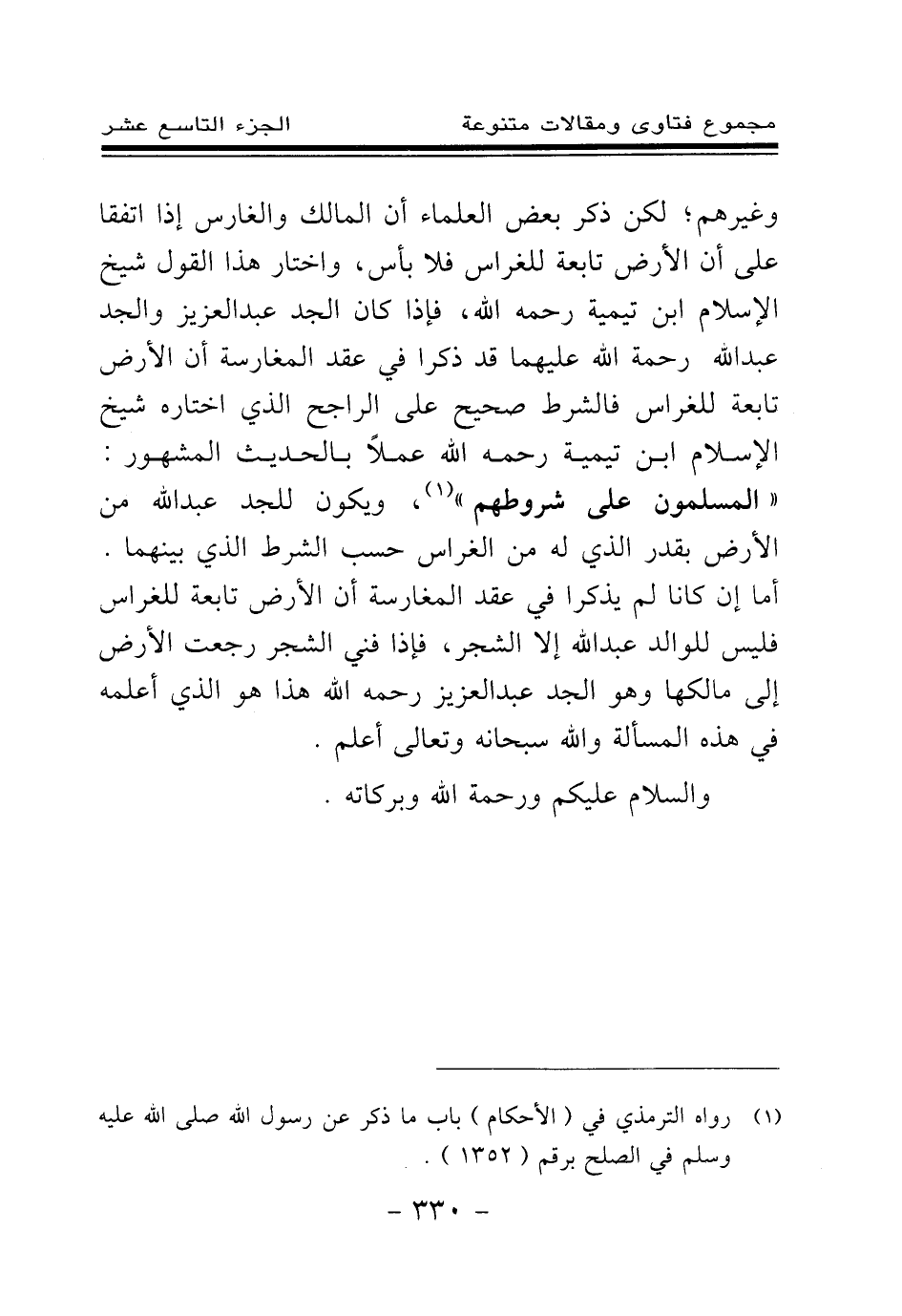 وغيرهم؛ لكن ذكر العلماء أن المالك والغارس إذا اتفقا على أن الأرض تابعة للغراس فلا بأس، واختار هذا القول شيخ الإسلام ابن تيمية رحمه الله، فإذا كان الجد عبد العزيز والجد عبد الله رحمة الله عليهما قد ذكرا في عقد المغارسة أن الأرض تابعة للغراس فالشرط صحيح على الراجح الذي اختاره شيخ الإسلام ابن تيمية رحمه الله عملا بالحديث المشهور: «المسلمون على شروطهم (¬1) » ، ويكون للجد عبد الله من الأرض بقدر الذي له من الغراس حسب الشرط الذي بينهما.