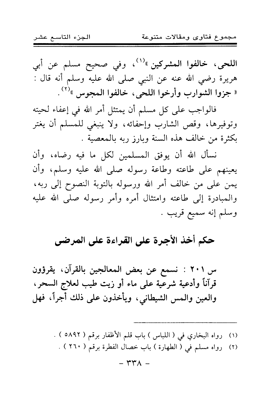 س 201: نسمع عن بعض المعالجين بالقرآن، يقرؤون قرآنا وأدعية شرعية على ماء أو زيت طيب لعلاج السحر، والعين والمس الشيطاني، ويأخذون على ذلك أجرا، فهل