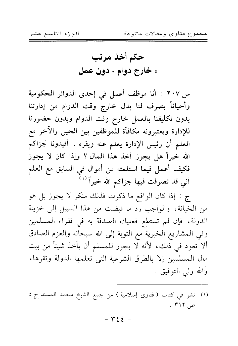س 207: أنا موظف أعمل في إحدى الدوائر الحكومية وأحيانا يصرف لنا بدل خارج وقت الدوام من إدارتنا بدون تكليفنا بالعمل خارج وقت الدوام وبدون حضورنا للإدارة ويعتبرونه مكافأة للموظفين بين الحين والآخر مع العلم أن رئيس الإدارة يعلم عنه ويقره. أفيدونا جزاكم الله خيرا هل يجوز أخذ هذا المال؟ وإذا كان لا يجوز فكيف أعمل فيما استلمته من أموال في السابق مع العلم أني قد تصرفت فيها جزاكم الله خيرا (¬1) .