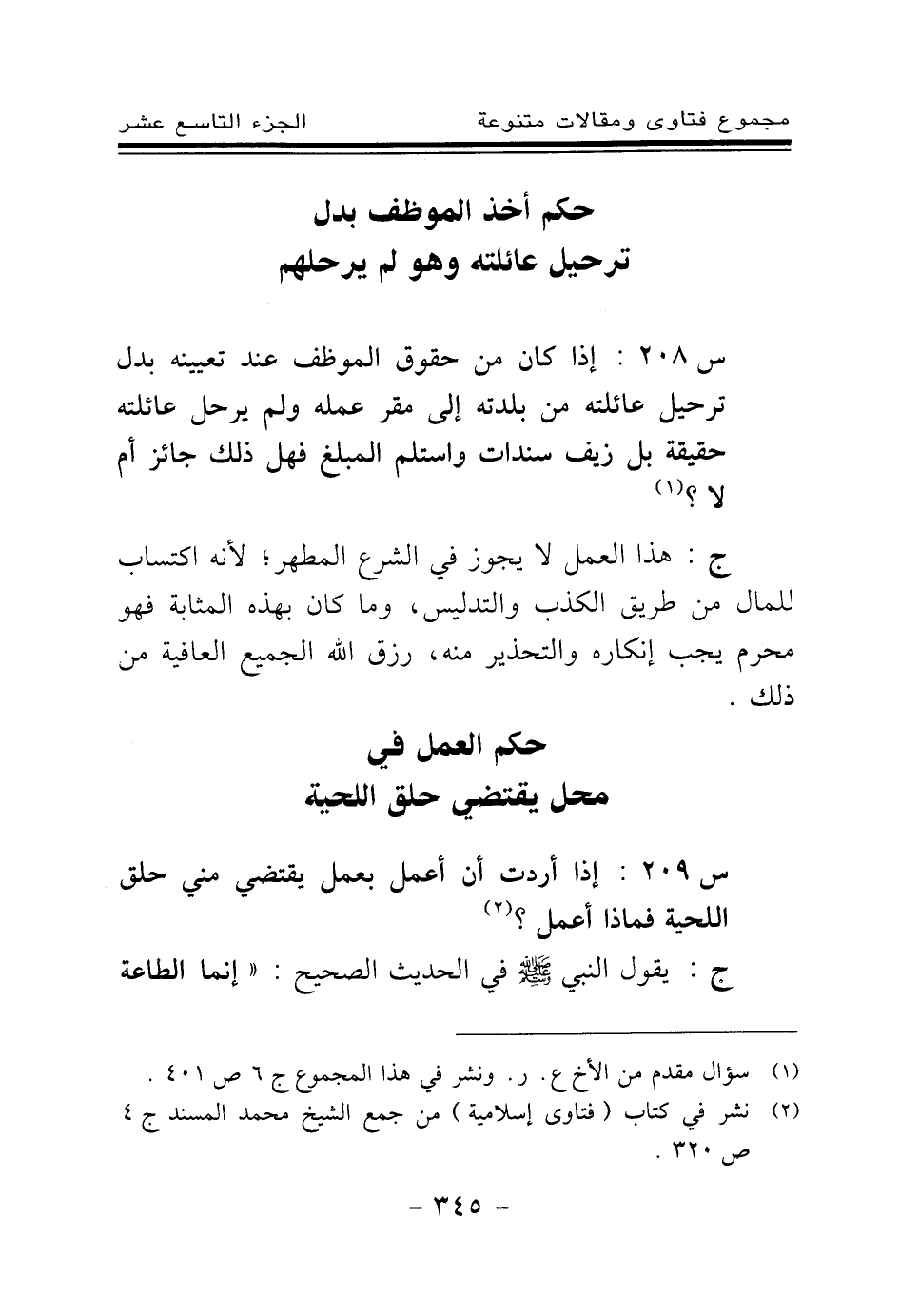 س 208: إذا كان من حقوق الموظف عند تعيينه بدل ترحيل عائلته من بلدته إلى مقر عمله ولم يرحل عائلته حقيقة بل زيف سندات واستلم المبلغ فهل ذلك جائز أم لا؟ (¬1) .