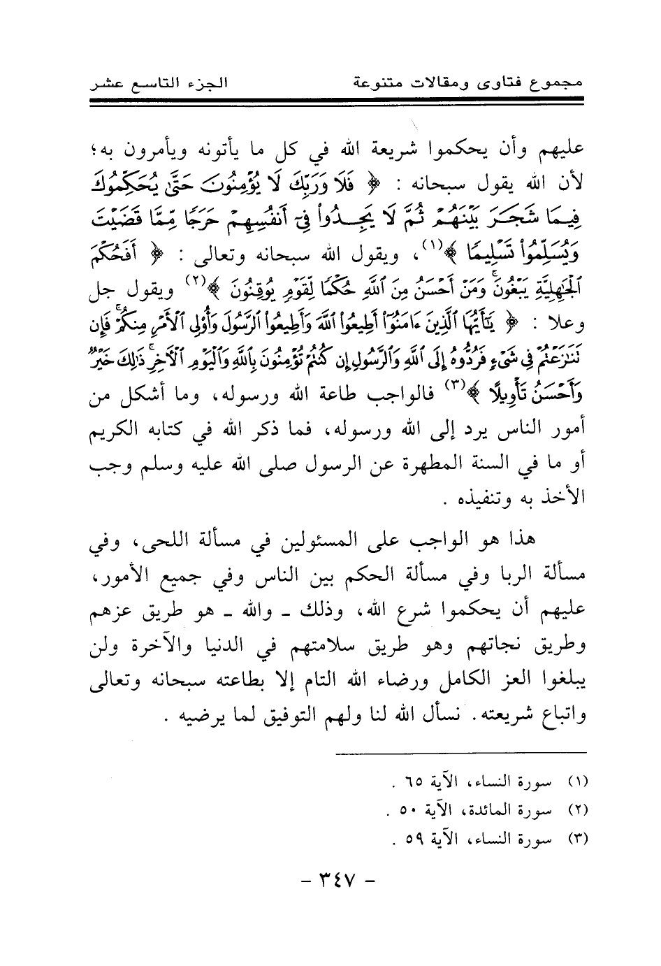 عليهم وأن يحكموا شريعة الله في كل ما يأتونه ويأمرون به؛ لأن الله يقول سبحانه: {فَلَا وَرَبِّكَ لَا يُؤْمِنُونَ حَتَّى يُحَكِّمُوكَ فِيمَا شَجَرَ بَيْنَهُمْ ثُمَّ لَا يَجِدُوا فِي أَنْفُسِهِمْ حَرَجًا مِمَّا قَضَيْتَ وَيُسَلِّمُوا تَسْلِيمًا} (¬1) ويقول الله سبحانه وتعالى: {أَفَحُكْمَ الْجَاهِلِيَّةِ يَبْغُونَ وَمَنْ أَحْسَنُ مِنَ اللَّهِ حُكْمًا لِقَوْمٍ يُوقِنُونَ} (¬2) ويقول جل وعلا: {يَا أَيُّهَا الَّذِينَ آمَنُوا أَطِيعُوا اللَّهَ وَأَطِيعُوا الرَّسُولَ وَأُولِي الْأَمْرِ مِنْكُمْ فَإِنْ تَنَازَعْتُمْ فِي شَيْءٍ فَرُدُّوهُ إِلَى اللَّهِ وَالرَّسُولِ إِنْ كُنْتُمْ تُؤْمِنُونَ بِاللَّهِ وَالْيَوْمِ الْآخِرِ ذَلِكَ خَيْرٌ وَأَحْسَنُ تَأْوِيلًا} (¬3) فالواجب طاعة الله ورسوله، وما أشكل من أمور الناس يرد إلى الله ورسوله، فما ذكر الله في كتابه الكريم أو ما في السنة المطهرة عن الرسول صلى الله عليه وسلم وجب الآخذ به وتنفيذه.