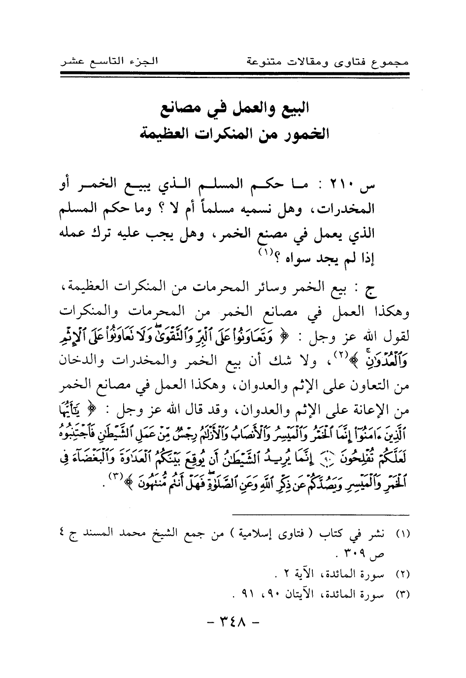 ج: بيع الخمر وسائر المحرمات من المنكرات العظيمة، وهكذا العمل في مصانع الخمر من المحرمات والمنكرات لقول الله عز وجل: {وَتَعَاوَنُوا عَلَى الْبِرِّ وَالتَّقْوَى وَلَا تَعَاوَنُوا عَلَى الْإِثْمِ وَالْعُدْوَانِ} (¬2) ولا شك أن بيع الخمر والمخدرات والدخان من التعاون على الإثم والعدوان، وهكذا العمل في مصانع الخمر من الإعانة على الإثم والعدوان، وقد قال الله عز وجل: {يَا أَيُّهَا الَّذِينَ آمَنُوا إِنَّمَا الْخَمْرُ وَالْمَيْسِرُ وَالْأَنْصَابُ وَالْأَزْلَامُ رِجْسٌ مِنْ عَمَلِ الشَّيْطَانِ فَاجْتَنِبُوهُ لَعَلَّكُمْ تُفْلِحُونَ} (¬3) {إِنَّمَا يُرِيدُ الشَّيْطَانُ أَنْ يُوقِعَ بَيْنَكُمُ الْعَدَاوَةَ وَالْبَغْضَاءَ فِي الْخَمْرِ وَالْمَيْسِرِ وَيَصُدَّكُمْ عَنْ ذِكْرِ اللَّهِ وَعَنِ الصَّلَاةِ فَهَلْ أَنْتُمْ مُنْتَهُونَ} (¬4)