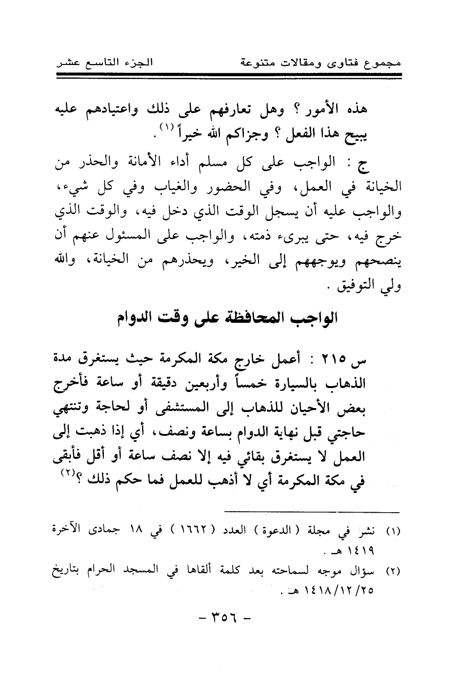 س 215: أعمل خارج مكة المكرمة حيث يستغرق مدة الذهاب بالسيارة خمسا وأربعين دقيقة أو ساعة فأخرج بعض الأحيان للذهاب إلى المستشفى أو لحاجة وتنتهي حاجتي قبل نهاية الدوام بساعة ونصف، أي إذا ذهبت إلى العمل لا يستغرق بقائي فيه إلا نصف ساعة أو أقل فأبقى في مكة المكرمة أي لا أذهب للعمل فما حكم ذلك؟ (¬1) .
