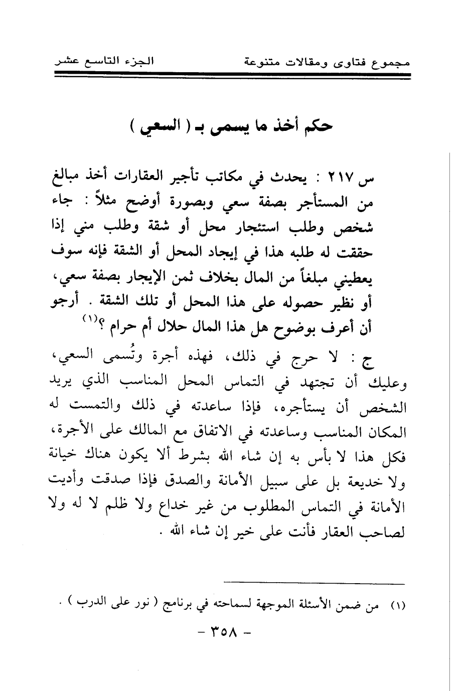 س 217: يحدث في مكاتب تأجير العقارات أخذ مبالغ من المستأجر بصفة سعي وبصورة أوضح مثلا: جاء شخص وطلب استئجار محل أو شقة وطلب مني إذا حققت له طلبه هذا في إيجاد المحل أو الشقة فإنه سوف يعطيني مبلغا من المال بخلاف ثمن الإيجار بصفة سعي، أو نظير حصوله على هذا المحل أو تلك الشقة، أرجو أن أعرف بوضوح هل هذا المال حلال أم حرام؟ (¬1) .
