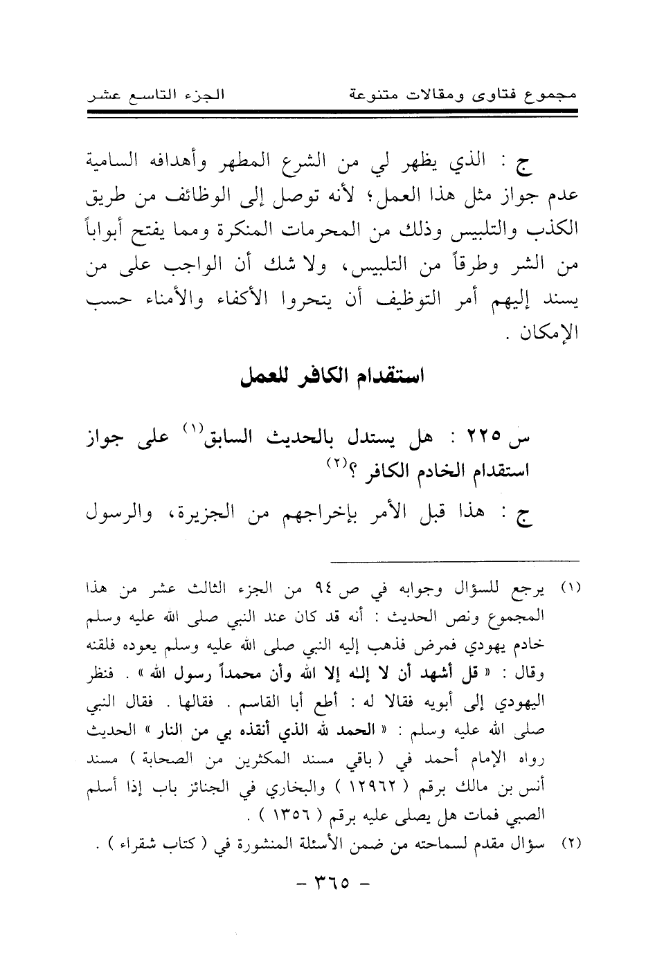 س 225: هل يستدل بالحديث السابق. على جواز استقدام الخادم الكافر؟ (¬1) .