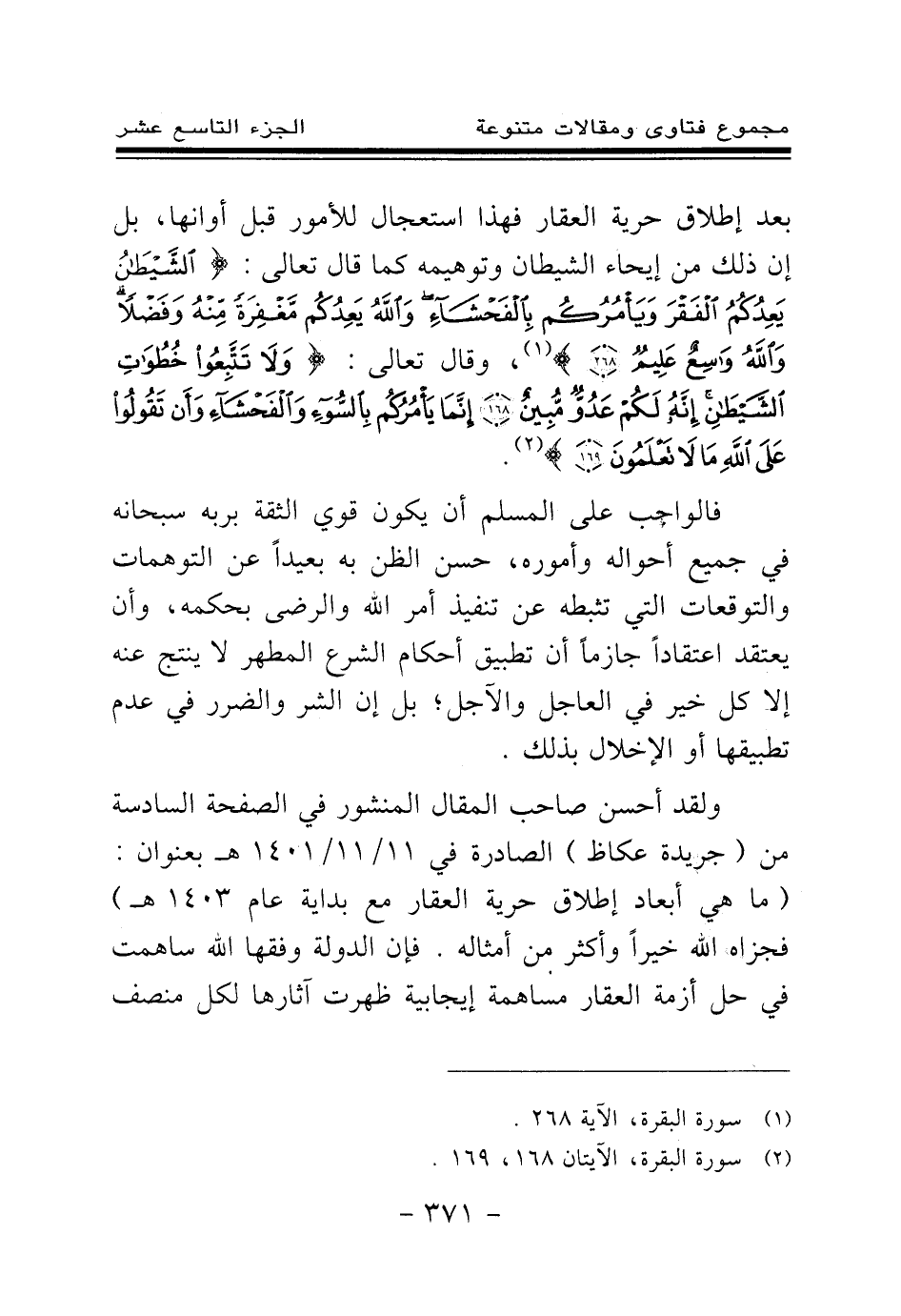 بعد إطلاق حرية العقار فهذا استعجال للأمور قبل أوانها، بل إن ذلك من إيحاء الشيطان وتوهيمه كما قال تعالى: {الشَّيْطَانُ يَعِدُكُمُ الْفَقْرَ وَيَأْمُرُكُمْ بِالْفَحْشَاءِ وَاللَّهُ يَعِدُكُمْ مَغْفِرَةً مِنْهُ وَفَضْلًا وَاللَّهُ وَاسِعٌ عَلِيمٌ} (¬1) وقال تعالى: {وَلَا تَتَّبِعُوا خُطُوَاتِ الشَّيْطَانِ إِنَّهُ لَكُمْ عَدُوٌّ مُبِينٌ} (¬2) {إِنَّمَا يَأْمُرُكُمْ بِالسُّوءِ وَالْفَحْشَاءِ وَأَنْ تَقُولُوا عَلَى اللَّهِ مَا لَا تَعْلَمُونَ} (¬3)